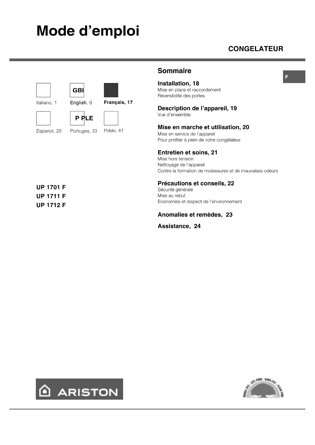 Retrouvez gratuitement la notice de l'appareil UP1701F Ariston Thermo au format PDF.