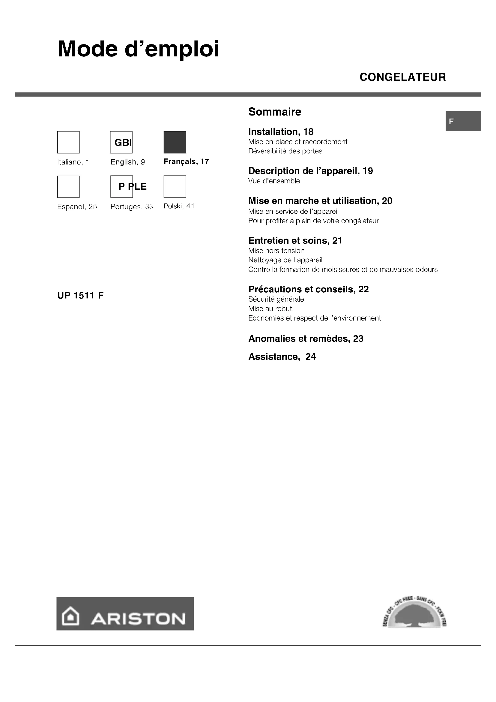 Retrouvez gratuitement la notice de l'appareil UP1511F Ariston Thermo au format PDF.