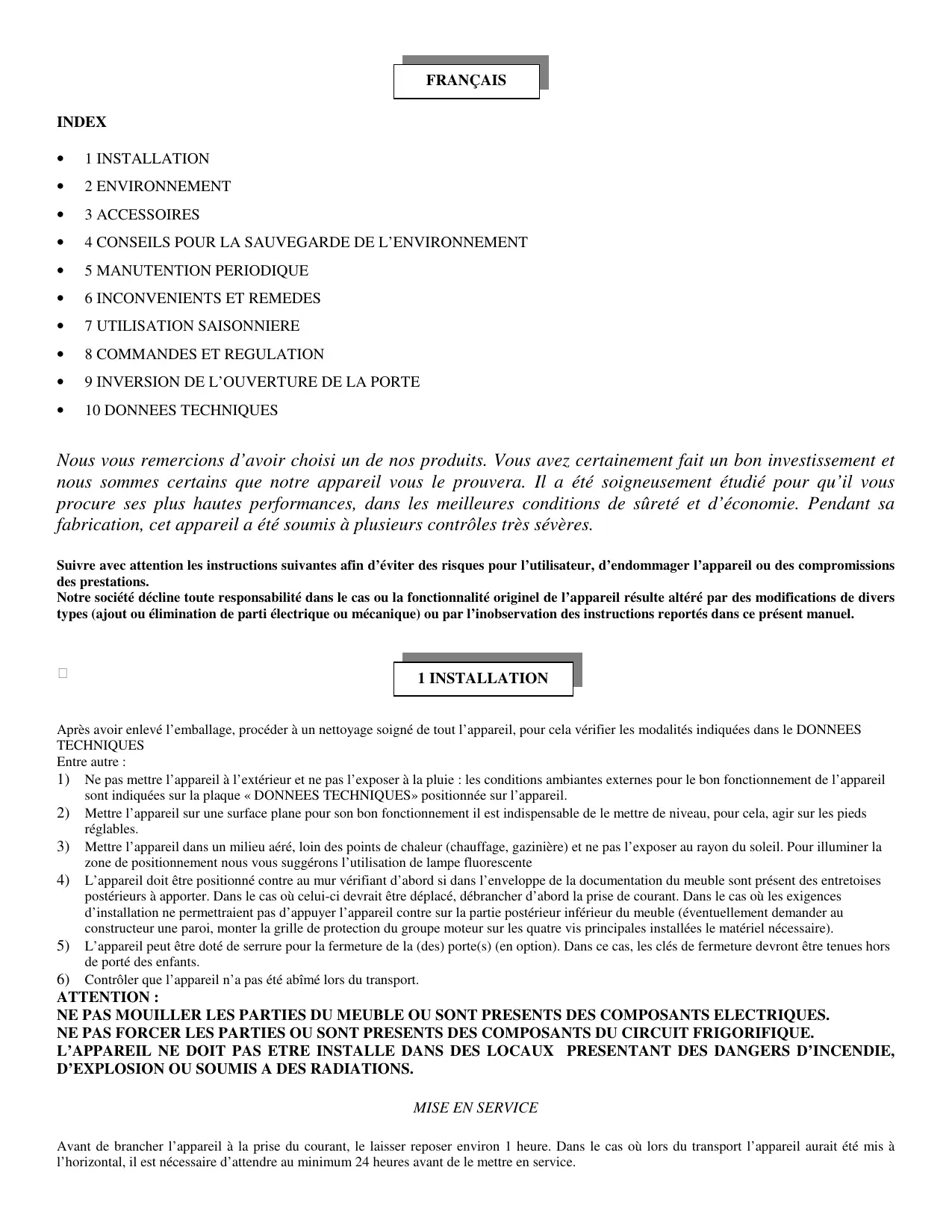 NE PAS MOUILLER LES PARTIES DU MEUBLE OU SONT PRESENTS DES COMPOSANTS ELECTRIQUES. NE PAS FORCER LES PARTIES OU SONT PRESENTS DES COMPOSANTS DU CIRCUIT FRIGORIFIQUE. L’APPAREIL NE DOIT PAS ETRE INSTALLE DANS DES LOCAUX PRESENTANT DES DANGERS D’INCENDIE, D’EXPLOSION OU SOUMIS A DES RADIATIONS. MISE EN SERVICE Avant de brancher l’appareil à la prise du courant, le laisser reposer environ 1 heure. Dans le cas où lors du transport l’appareil aurait été mis à l’horizontal, il est nécessaire d’attendre au minimum 24 heures avant de le mettre en service.