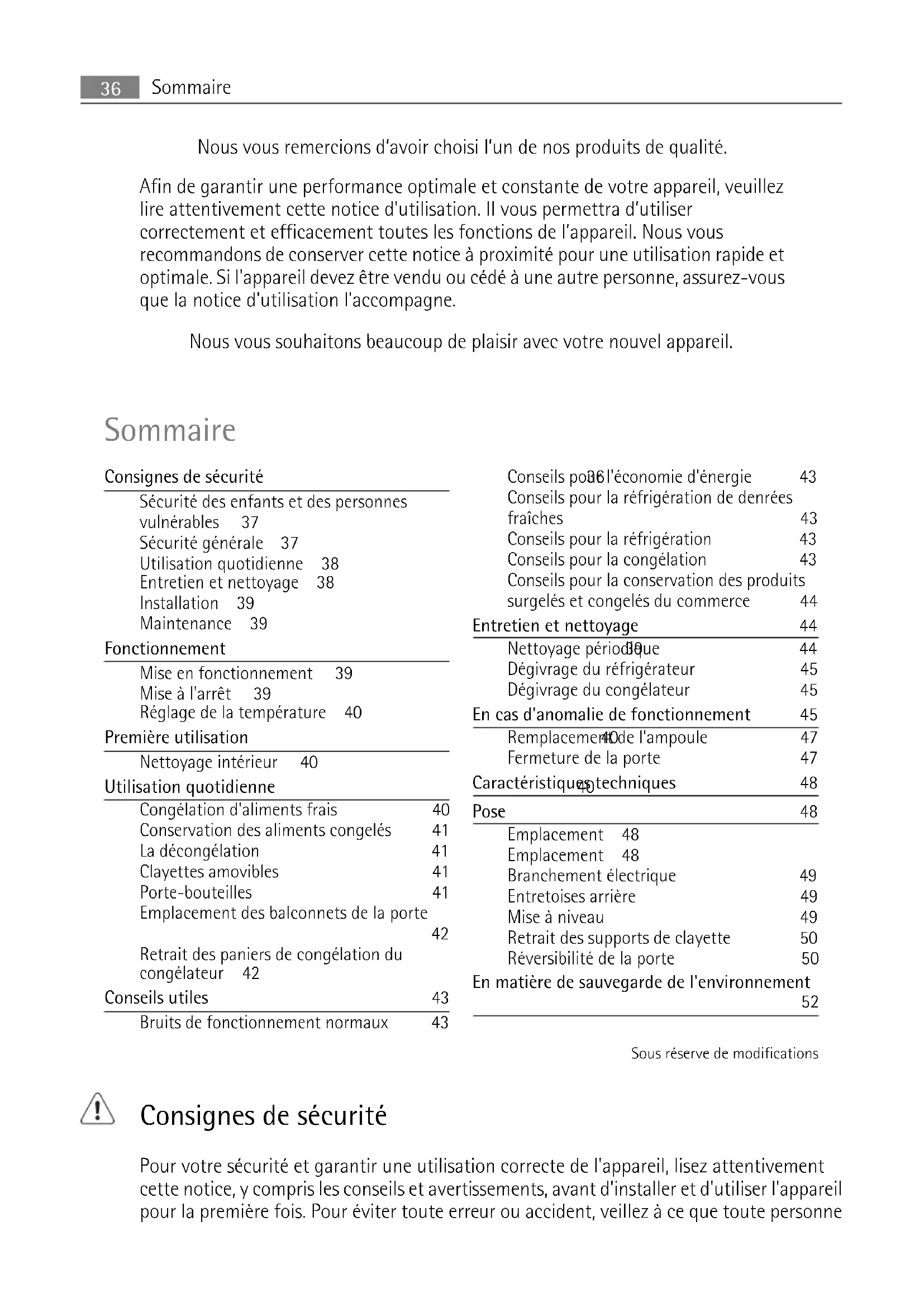 InstallationEnvironmental concerns The symbol on the product or on its packaging indicates that this product may not be treated as household waste. Instead it should be taken to the appropriate collection point for the recycling of electrical and electronic equipment. By ensuring this product is disposed of correctly, you will help prevent potential negative consequences for the environment and human health, which could otherwise be caused by inappropriate waste handling of this product. For more detailed information about recycling of this product, please contact your local council, your household waste disposal service or the shop where you purchased the product. Environmental concerns 35Nous vous remercions d’avoir choisi l’un de nos produits de qualité. Afin de garantir une performance optimale et constante de votre appareil, veuillez lire attentivement cette notice d'utilisation. Il vous permettra d’utiliser correctement et efficacement toutes les fonctions de l’appareil. Nous vous recommandons de conserver cette notice à proximité pour une utilisation rapide et optimale. Si l'appareil devez être vendu ou cédé à une autre personne, assurez-vous que la notice d'utilisation l'accompagne. Nous vous souhaitons beaucoup de plaisir avec votre nouvel appareil. Sommaire Consignes de sécurité 36 Sécurité des enfants et des personnes vulnérables 37 Sécurité générale 37 Utilisation quotidienne 38 Entretien et nettoyage 38 Installation 39 Maintenance 39 Fonctionnement 39 Mise en fonctionnement 39 Mise à l'arrêt 39 Réglage de la température 40 Première utilisation 40 Nettoyage intérieur 40 Utilisation quotidienne 40 Congélation d'aliments frais 40 Conservation des aliments congelés 41 La décongélation 41 Clayettes amovibles 41 Porte-bouteilles 41 Emplacement des balconnets de la porte