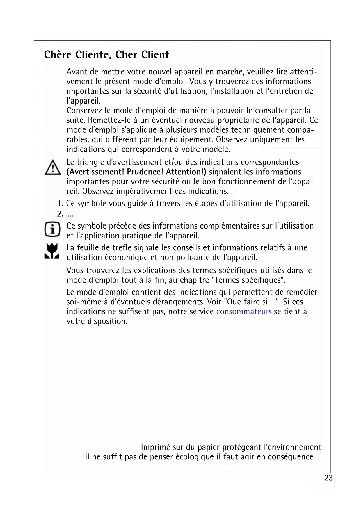 - ". Si ces indications ne suffisent pas, notre service consommateurs se tient à votre disposition. Imprimé sur du papier protégeant l’environnement il ne suffit pas de penser écologique il faut agir en conséquence p. 24