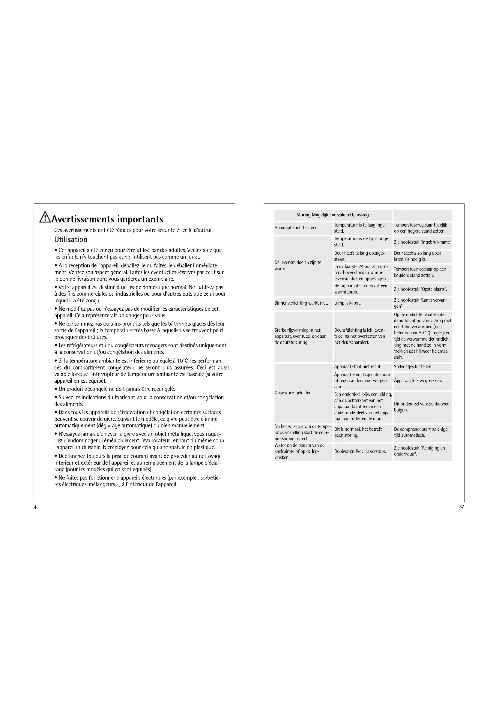 | La température à l'intérieur de l'apparil est trop chaude | Vérifie que: • le thermostat n'est pas sur une position trop hasse, • les dénées sont correctement placées (voir paragraphe " Emplacement des dénées"), • les aliments ne sont pas en contact avec l'éva- porateur afin que l'air circule librement, • la porte est correctement fermée, • le joint de porte est en bon état et propre, • trop d'aliments n ont pas été introduits en même temps, • l'apparil est dans une pièce où la circulation d'air est normal, • l'apparil n'est pas situé à proximité d'une source de chaleur. |