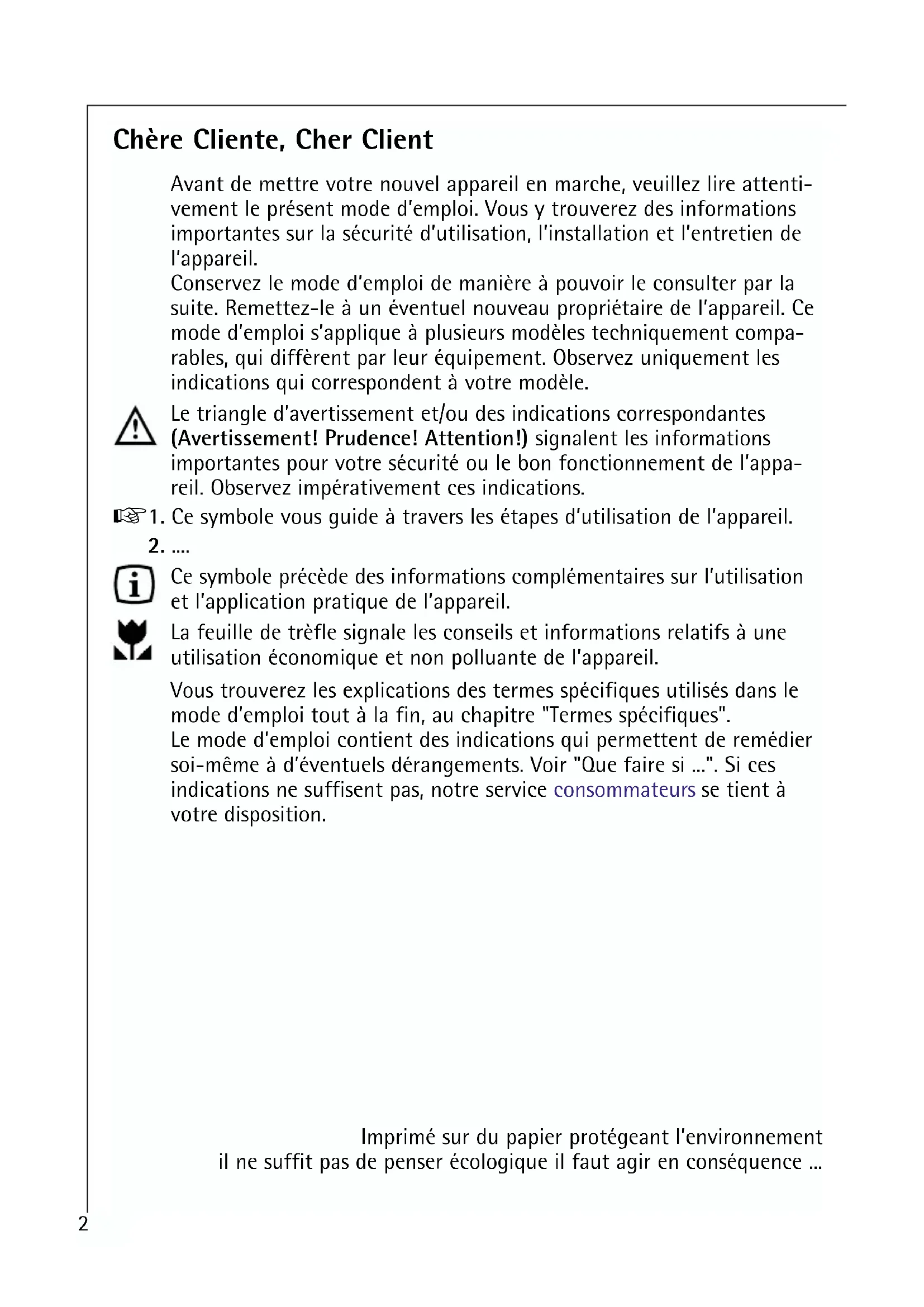 - ". Si ces indications ne suffisent pas, notre service consommateurs se tient à votre disposition. Imprimé sur du papier protégeant l’environnement il ne suffit pas de penser écologique il faut agir en conséquence p. 3