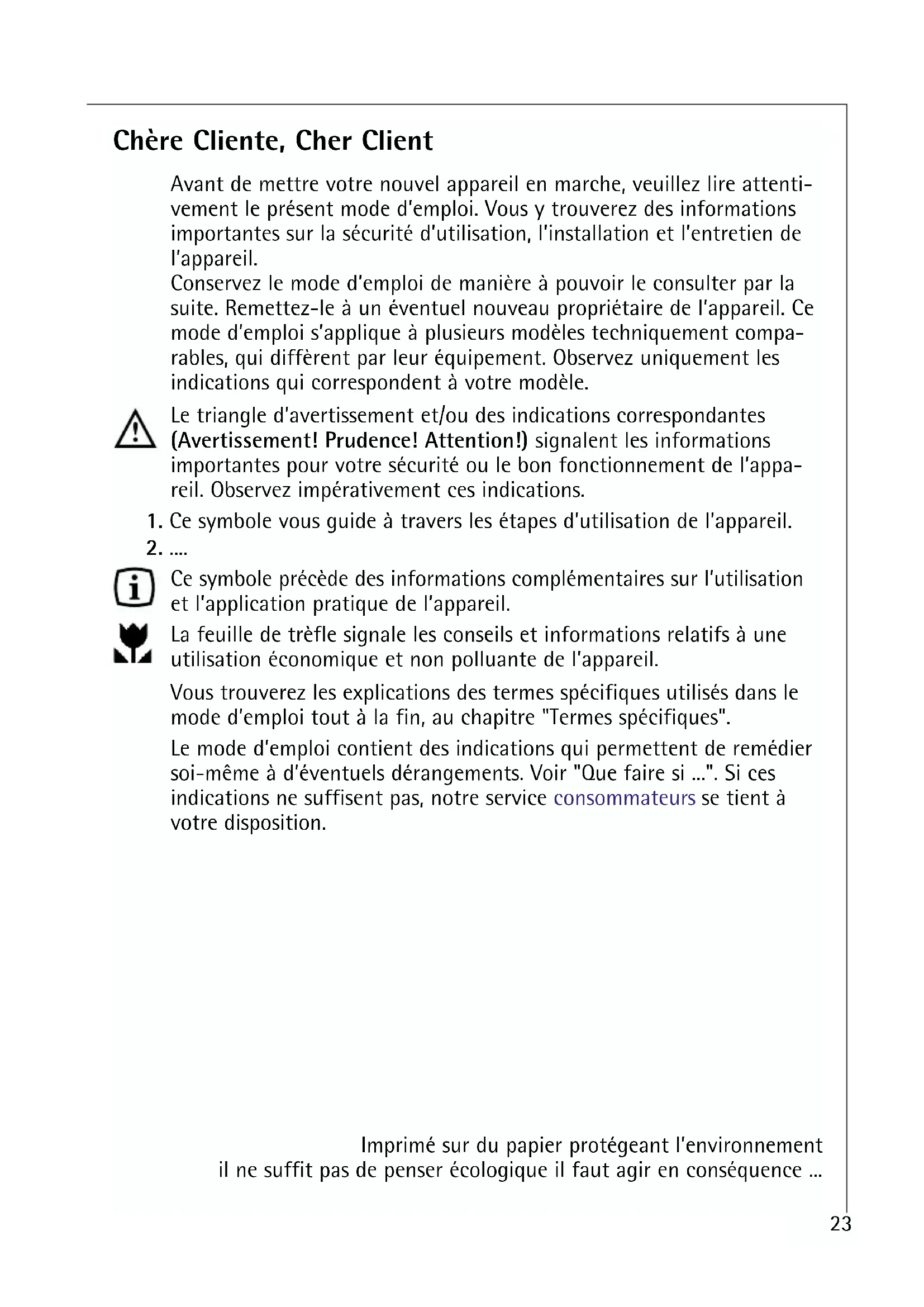 - ". Si ces indications ne suffisent pas, notre service consommateurs se tient à votre disposition. Imprimé sur du papier protégeant l’environnement il ne suffit pas de penser écologique il faut agir en conséquence p. 24