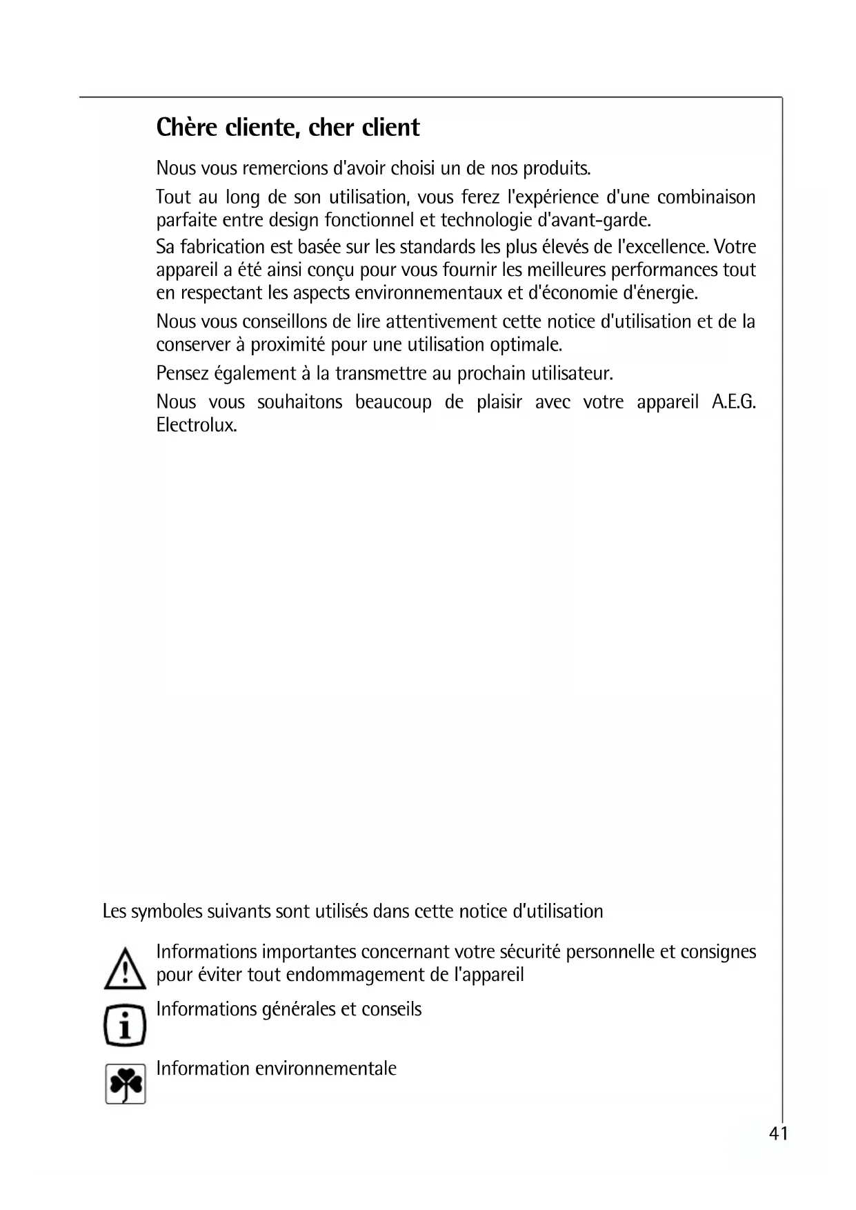- Condenser The condenser normally has the form of a grid. The refrigerant compressed in the compressor is liquefied in the condenser. During this process, heat is released to the surrounding air at the surface of the condenser. The con- denser is mounted on the base of the appliance.41 Chère cliente, cher client Nous vous remercions d'avoir choisi un de nos produits. Tout au long de son utilisation, vous ferez l'expérience d'une combinaison parfaite entre design fonctionnel et technologie d'avant-garde. Sa fabrication est basée sur les standards les plus élevés de l'excellence. Votre appareil a été ainsi conçu pour vous fournir les meilleures performances tout en respectant les aspects environnementaux et d'économie d'énergie. Nous vous conseillons de lire attentivement cette notice d'utilisation et de la conserver à proximité pour une utilisation optimale. Pensez également à la transmettre au prochain utilisateur. Nous vous souhaitons beaucoup de plaisir avec votre appareil A.E.G. Electrolux. Les symboles suivants sont utilisés dans cette notice d’utilisation Informations importantes concernant votre sécurité personnelle et consignes pour éviter tout endommagement de l'appareil Informations générales et conseils Information environnementale42 Sommaire Sécurité. . . . . . . . . . . . . . . . . . . . . . . . . . . . . . . . . . . . . . . . . . . . . . . . . . . . . 43 Protection de l’environnement . . . . . . . . . . . . . . . . . . . . . . . . . . . . . . . . . . 45 Information sur l’emballage de l’appareil . . . . . . . . . . . . . . . . . . . . . . . . . . . 45 Mise au rebut des anciens appareils. . . . . . . . . . . . . . . . . . . . . . . . . . . . . . . . 45 Retrait de la protection pour le transport . . . . . . . . . . . . . . . . . . . . . . . . . 46 Installation . . . . . . . . . . . . . . . . . . . . . . . . . . . . . . . . . . . . . . . . . . . . . . . . . . 46 Emplacement. . . . . . . . . . . . . . . . . . . . . . . . . . . . . . . . . . . . . . . . . . . . . . . . . . . 46 L’appareil frigorifique a besoin d’air. . . . . . . . . . . . . . . . . . . . . . . . . . . . . . . . 47 Encastrement. . . . . . . . . . . . . . . . . . . . . . . . . . . . . . . . . . . . . . . . . . . . . . . . . . . 48 Branchement électrique . . . . . . . . . . . . . . . . . . . . . . . . . . . . . . . . . . . . . . . . . . 48 Description de l’appareil . . . . . . . . . . . . . . . . . . . . . . . . . . . . . . . . . . . . . . . 49 Vue de l’appareil . . . . . . . . . . . . . . . . . . . . . . . . . . . . . . . . . . . . . . . . . . . . . . . 49 Avant la mise en service . . . . . . . . . . . . . . . . . . . . . . . . . . . . . . . . . . . . . . . 50 Mise en service et réglage de la temperature . . . . . . . . . . . . . . . . . . . . . . 50 Arrêt de l’appareil . . . . . . . . . . . . . . . . . . . . . . . . . . . . . . . . . . . . . . . . . . . . 51 Equipement intérieur. . . . . . . . . . . . . . . . . . . . . . . . . . . . . . . . . . . . . . . . . . 52 Clayettes. . . . . . . . . . . . . . . . . . . . . . . . . . . . . . . . . . . . . . . . . . . . . . . . . . . . . . . 52 Porte intérieure réglable . . . . . . . . . . . . . . . . . . . . . . . . . . . . . . . . . . . . . . . . . 52 Porte-bouteille . . . . . . . . . . . . . . . . . . . . . . . . . . . . . . . . . . . . . . . . . . . . . . . . . 53 Contrôle de l’humidité.. . . . . . . . . . . . . . . . . . . . . . . . . . . . . . . . . . . . . . . . . . . 53 Boîte variable . . . . . . . . . . . . . . . . . . . . . . . . . . . . . . . . . . . . . . . . . . . . . . . . . .53 Rangement correct . . . . . . . . . . . . . . . . . . . . . . . . . . . . . . . . . . . . . . . . . . .54 Dégivrage . . . . . . . . . . . . . . . . . . . . . . . . . . . . . . . . . . . . . . . . . . . . . . . . . .55 Le compartiment réfrigérateur dégivre automatiquement . . . . . . . . . . . . . .55 Entretien et nettoyage. . . . . . . . . . . . . . . . . . . . . . . . . . . . . . . . . . . . . . . . . 55 Conseils d’économie d’énergie . . . . . . . . . . . . . . . . . . . . . . . . . . . . . . . . . . 56 Que faire si .... . . . . . . . . . . . . . . . . . . . . . . . . . . . . . . . . . . . . . . . . . . . . . . . 57 En cas d’anomalie de fonctionnement . . . . . . . . . . . . . . . . . . . . . . . . . . . . . . 57 Remplacement de l’ampoule d’éclairage . . . . . . . . . . . . . . . . . . . . . . . . . . . . 58 Bruits de fonctionnement . . . . . . . . . . . . . . . . . . . . . . . . . . . . . . . . . . . . . . 59 Règlements, normes, directives. . . . . . . . . . . . . . . . . . . . . . . . . . . . . . . . . . 59 Termes techniques . . . . . . . . . . . . . . . . . . . . . . . . . . . . . . . . . . . . . . . . . . . . 6043 Sécurité La sécurité de nos appareils est conforme aux règles reconnues de la technique et à la loi sur la sécurité des appareils. Nous nous voyons cependant obligés de vous familiariser avec les conseils de sécurité sui- vants: Utilisation conforme à la destination