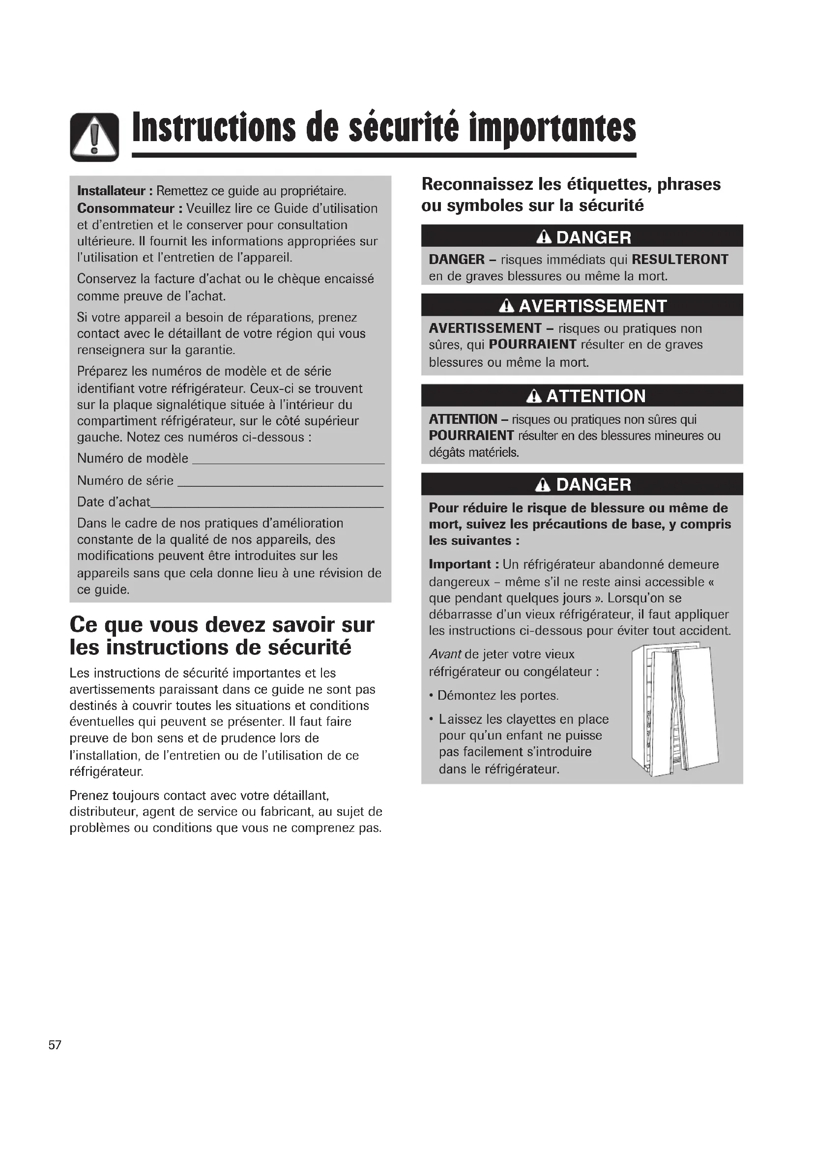 aissez le s clayette s en place pour qu’un enfant ne puisse pas facilement s’introduire dans le réfrigérateur. DANGER Reconnaissez les étiquettes, phrases ou symboles sur la sécurité58 Instructions de sécurité importantes Pour réduire le risque d’incendie, choc électrique,blessure ou même de mort lors de l’utilisation duréfrigérateur, suivez ces précautions de base, y comprisles suivantes :1. Lisez toutes les instructions avant d’utiliser le réfrigérateur.2. Respectez les prescriptions de tous les codes etrèglements locaux.3. Observez les instructions de liaison à la terre.4. En cas d’incertitude quant à la qualité de la liaison à laterre de l’appareil, consultez un électricien qualifié. N’utilisez pas une canalisation de gaz pour la liaison à laterre.