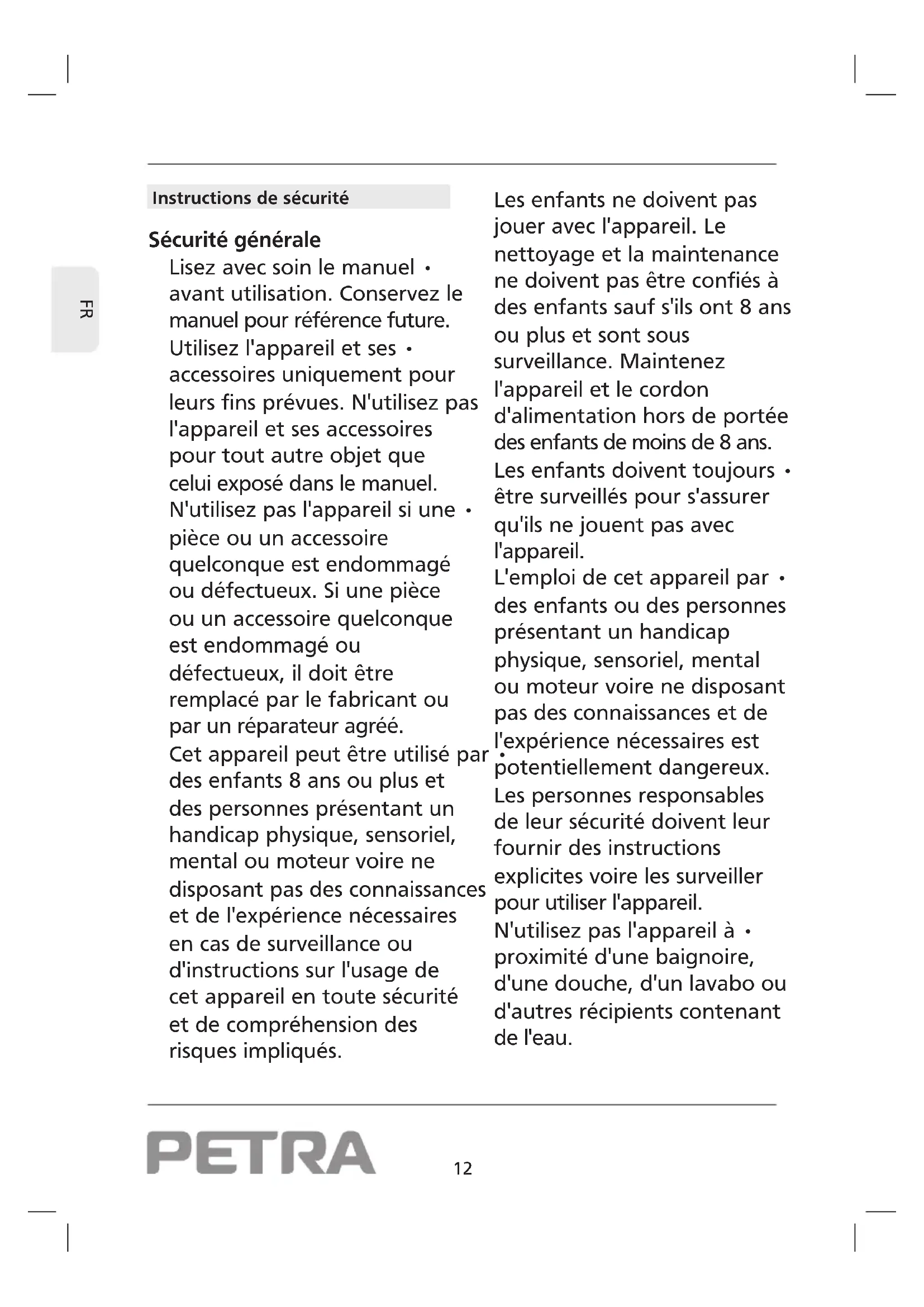 Instructions de sécurité Sécurité générale Lisez avec soin le manuel • avant utilisation. Conservez le manuel pour référence future. Utilisez l'appareil et ses • accessoires uniquement pour leurs fins prévues. N'utilisez pas l'appareil et ses accessoires pour tout autre objet que celui exposé dans le manuel. N'utilisez pas l'appareil si une • pièce ou un accessoire quelconque est endommagé ou défectueux. Si une pièce ou un accessoire quelconque est endommagé ou défectueux, il doit être remplacé par le fabricant ou par un réparateur agréé. Cet appareil peut être utilisé par • des enfants 8 ans ou plus et des personnes présentant un handicap physique, sensoriel, mental ou moteur voire ne disposant pas des connaissances et de l'expérience nécessaires en cas de surveillance ou d'instructions sur l'usage de cet appareil en toute sécurité et de compréhension des risques impliqués. Les enfants ne doivent pas jouer avec l'appareil. Le nettoyage et la maintenance ne doivent pas être confiés à des enfants sauf s'ils ont 8 ans ou plus et sont sous surveillance. Maintenez l'appareil et le cordon d'alimentation hors de portée des enfants de moins de 8 ans. Les enfants doivent toujours • être surveillés pour s'assurer qu'ils ne jouent pas avec l'appareil. L'emploi de cet appareil par • des enfants ou des personnes présentant un handicap physique, sensoriel, mental ou moteur voire ne disposant pas des connaissances et de l'expérience nécessaires est potentiellement dangereux. Les personnes responsables de leur sécurité doivent leur fournir des instructions explicites voire les surveiller pour utiliser l'appareil. N'utilisez pas l'appareil à • proximité d'une baignoire, d'une douche, d'un lavabo ou d'autres récipients contenant de l'eau.13