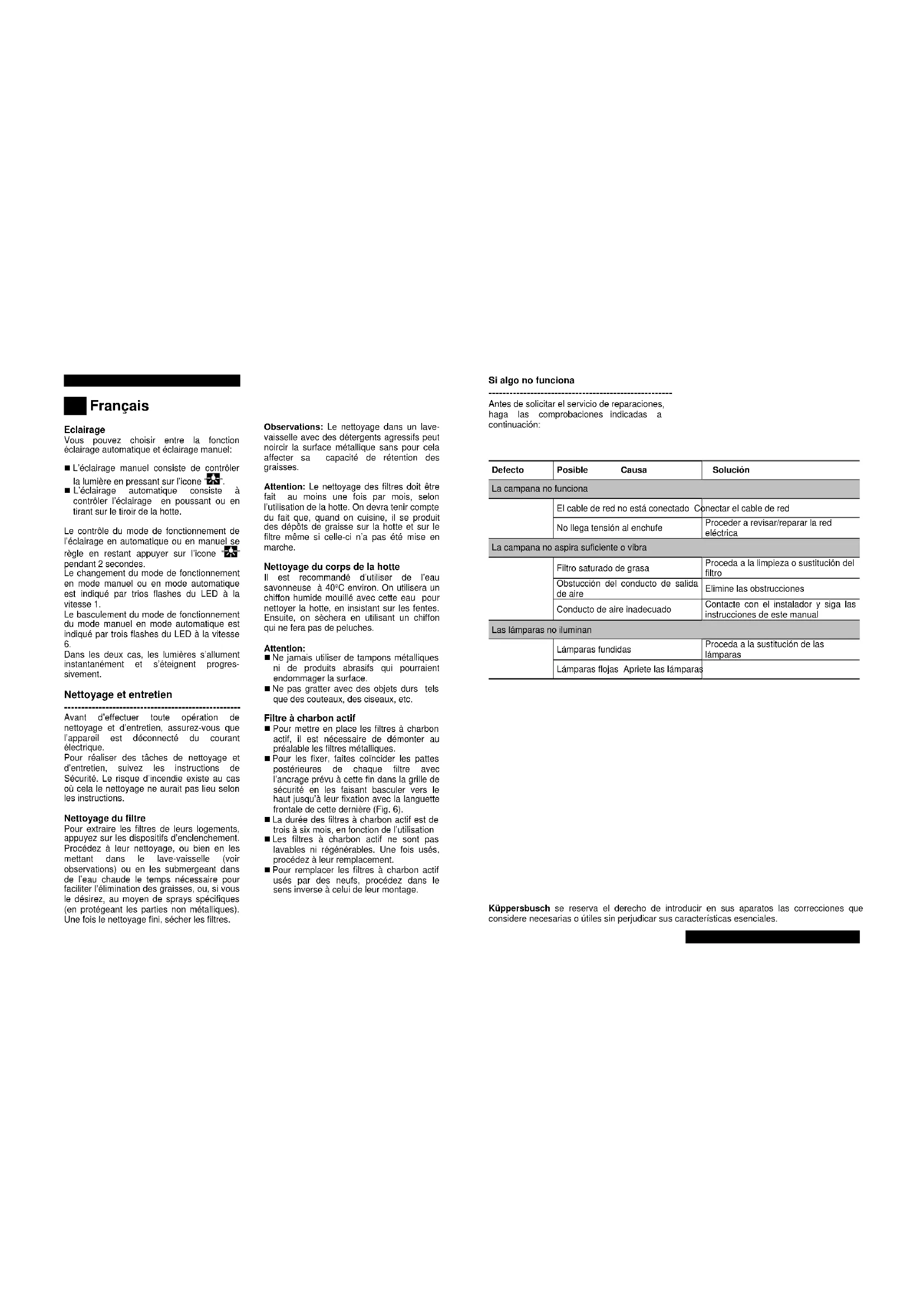 Küppersbusch reserves the right to make corrections in its appliances wherever it considers these necessary or useful, without harming their essential features.Français Cher Client, Félicitations pour votre choix. Nous sommes sûrs que cet appareil, moderne, fonctionnel et pratique, qui a été construit avec des matériaux de première qualité, vous satisfera pleinement. Avant d’utiliser la hotte pour la première fois, nous vous prions de lire toutes les sections de ce MANUEL D’INSTRUCTIONS afin d’obtenir le rendement maximum de l’appareil et d’éviter des pannes qui pourraient être causées par un usage incorrect ; il pourra aussi vous résoudre quelques petits problèmes. Conservez ce manuel car il vous donnera des informations utiles à tout moment en ce qui concerne votre hotte, et facilitera son usage par d’autres personnes. Instructions de sécurité