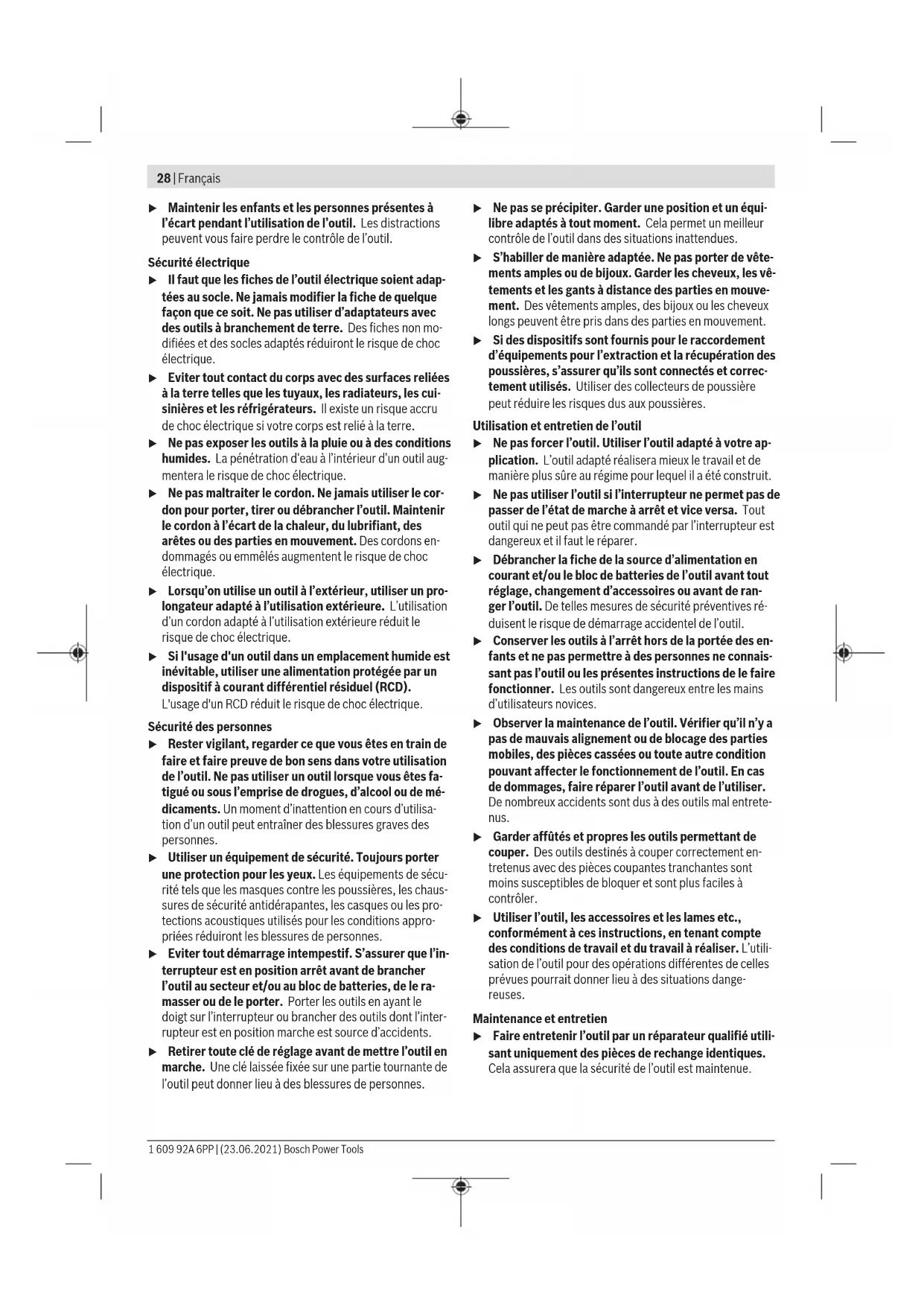The values specified for speed levels are guide values. u The rated speed of the accessory must be at least equal to the maximum speed marked on the power tool. Accessories running faster than their rated speed can break and fly apart. Working Advice u Pull the plug out of the socket before carrying out any work on the power tool. u Exercise caution when cutting slots in structural walls; see the "Information on structural design" section. u Clamp the workpiece if it is not secure under its own weight. u Do not load the power tool so heavily that it comes to a stop. u If the power tool has been subjected to a heavy load, continue to run it at no-load for several minutes to cool down the accessory. u Do not use the power tool with a cut-off stand. u Do not touch grinding and cutting discs until they have cooled down. The discs can become very hot while work- ing. Rough grinding u Never use cutting discs for rough grinding. The best rough grinding results are achieved with a set angle of 30° to 40°. Move the power tool back and forth with mod- erate pressure. This will ensure that the workpiece does not become too hot or discolour and that grooves are not formed. Flap Disc With the flap disc (accessory), curved surfaces and profiles can be worked. Flap discs have a considerably higher ser- vice life, lower noise levels and lower sanding temperatures than conventional sanding sheets. Cutting Metal u Always use the protective guard for cutting (9) when cutting with bonded abrasives. When carrying out abrasive cutting, use a moderate feed that is suited to the material being machined. Do not exert pressure on the cutting disc and do not tilt or swing the power tool. Do not attempt to reduce the speed of a cutting disc coming to a stop by applying pressure from the side. The power tool must always work in an up-grinding mo- tion. Otherwise, there is a risk that it will be pushed uncontrolled out of the cut. For best results when cut- ting profiles and rectangular tubing, start at the smallest cross section. Cutting stone u Provide sufficient dust extraction when cutting stone. u Wear a dust mask. u The power tool may be used only for dry cutting/grind- ing. For best results when cutting stone, use a diamond cutting disc. When using the extraction guard for cutting with a guide block (19), the vacuum cleaner must be approved for vacu- uming stone dust. Suitable vacuum cleaners are available from Bosch. Switch on the power tool and position it with the front part of the guide block on the workpiece. Move the power tool with a moderate feed motion that is suited to the material being ma- chined. When cutting especially hard materials such as con- crete with a high pebble content, the diamond cutting disc 1 609 92A 6PP | (23.06.2021) Bosch Power ToolsFrançais | 27 can overheat and become damaged as a result. This is clearly indicated by circular sparking, rotating with the dia- mond cutting disc. If this happens, stop cutting and allow the diamond cutting disc to cool down by running the power tool for a short time at maximum speed with no load. Working noticeably slower and with circular sparking indic- ate that the diamond cutting disc that has become dull. You can resharpen the disc by briefly cutting into abrasive mater- ial (e.g. lime-sand brick). Information on structural design Slots in load-bearing walls are subject to DIN 1053 part 1 or country-specific regulations. These regulations must be ob- served under all circumstances. Seek advice from the re- sponsible structural engineer, architect or construction su- pervisor before starting work. Maintenance and Service Maintenance and Cleaning u Pull the plug out of the socket before carrying out any work on the power tool. u To ensure safe and efficient operation, always keep the power tool and the ventilation slots clean. u In extreme conditions, always use a dust extractor if possible. Blow out ventilation slots frequently and in- stall a residual current device (RCD) upstream. When machining metals, conductive dust can settle inside the power tool, which can affect its protective insulation. Store and handle the accessories carefully. In order to avoid safety hazards, if the power supply cord needs to be replaced, this must be done by Bosch or by an after-sales service centre that is authorised to repair Bosch power tools. After-Sales Service and Application Service Our after-sales service responds to your questions concern- ing maintenance and repair of your product as well as spare parts. You can find explosion drawings and information on spare parts at: www.bosch-pt.com The Bosch product use advice team will be happy to help you with any questions about our products and their accessor- ies. In all correspondence and spare parts orders, please always include the 10‑digit article number given on the nameplate of the product. Great Britain Robert Bosch Ltd. (B.S.C.) P.O. Box 98 Broadwater Park North Orbital Road Denham Uxbridge UB 9 5HJ At www.bosch-pt.co.uk you can order spare parts or arrange the collection of a product in need of servicing or repair. Tel. Service: (0344) 7360109 E-Mail: boschservicecentre@bosch.com You can find further service addresses at: www.bosch-pt.com/serviceaddresses Disposal The power tool, accessories and packaging should be re- cycled in an environmentally friendly manner. Do not dispose of power tools along with household waste. Only for EU countries: According to the European Directive 2012/19/EU on Waste Electrical and Electronic Equipment and its implementation into national law, power tools that are no longer usable must be collected separately and disposed of in an environment- ally friendly manner. Only for United Kingdom According to Waste Electrical and Electronic Equipment Reg- ulations 2013 (2013/3113), power tools that are no longer usable must be collected separately and disposed of in an environmentally friendly manner. Français Consignes de sécurité Avertissements de sécurité généra