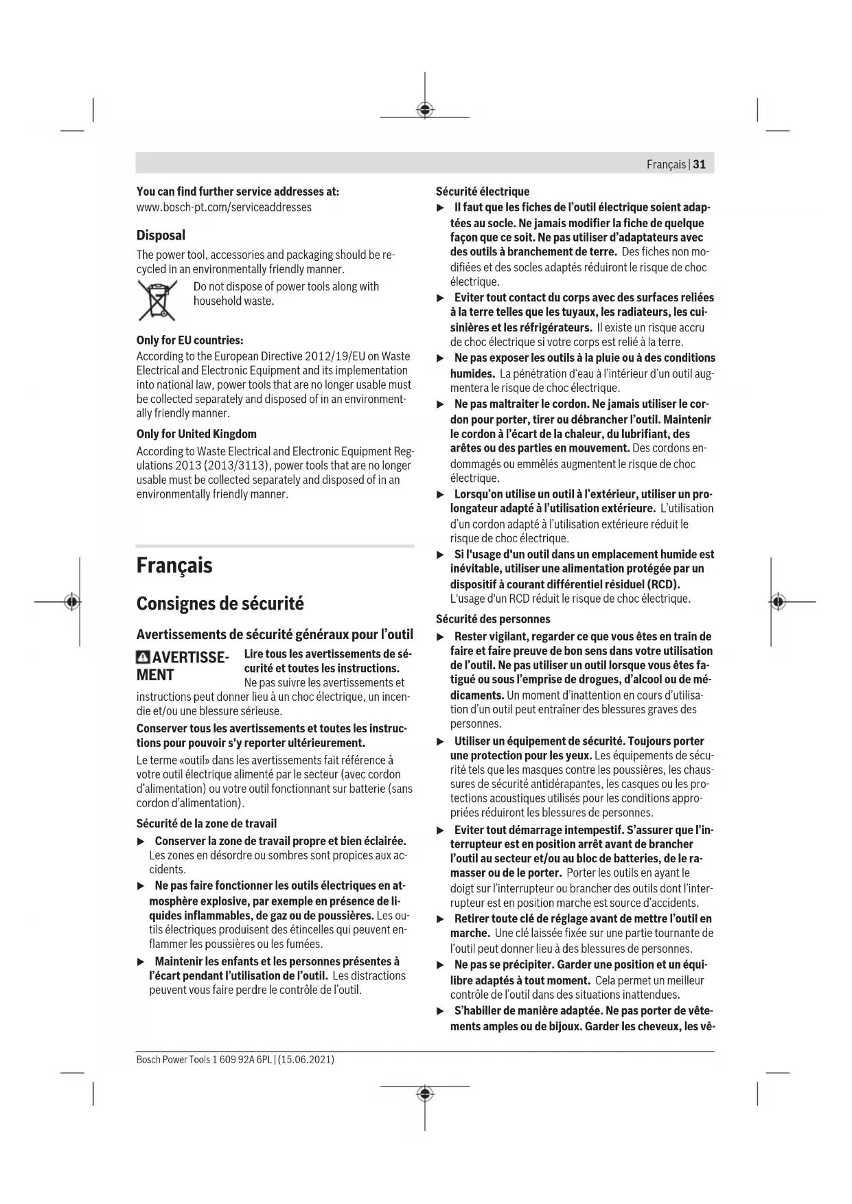 The values specified for speed levels are guide values. u The rated speed of the accessory must be at least equal to the maximum speed marked on the power tool. Accessories running faster than their rated speed can break and fly apart. Working Advice u Pull the plug out of the socket before carrying out any work on the power tool. u Exercise caution when cutting slots in structural walls; see the "Information on structural design" section. u Clamp the workpiece if it is not secure under its own weight. u Do not load the power tool so heavily that it comes to a stop. u If the power tool has been subjected to a heavy load, continue to run it at no-load for several minutes to cool down the accessory. u Do not use the power tool with a cut-off stand. u Do not touch grinding and cutting discs until they have cooled down. The discs can become very hot while work- ing. Flap Disc With the flap disc (accessory), curved surfaces and profiles can be worked. Flap discs have a considerably higher ser- Bosch Power Tools 1 609 92A 6PL | (15.06.2021)30 | English vice life, lower noise levels and lower sanding temperatures than conventional sanding sheets. Rough grinding u Never use cutting discs for rough grinding. The best rough grinding results are achieved with a set angle of 30° to 40°. Move the power tool back and forth with mod- erate pressure. This will ensure that the workpiece does not become too hot or discolour and that grooves are not formed. Cutting Metal u Always use the protective guard for cutting (6) when cutting bonded abrasives. When carrying out abrasive cutting, use a moderate feed that is suited to the material being machined. Do not exert pressure on the cutting disc and do not tilt or swing the power tool. Do not attempt to reduce the speed of a cutting disc coming to a stop by applying pressure from the side. The power tool must always work in an up-grinding mo- tion. Otherwise, there is a risk that it will be pushed uncontrolled out of the cut. For best results when cut- ting profiles and rectangular tubing, start at the smallest cross section. Cutting stone u Provide sufficient dust extraction when cutting stone. u Wear a dust mask. u The power tool may be used only for dry cutting/grind- ing. For best results when cutting stone, use a diamond cutting disc. When using the extraction guard for cutting with a guide block (18), the vacuum cleaner must be approved for vacu- uming stone dust. Suitable vacuum cleaners are available from Bosch. Switch on the power tool and position it with the front part of the guide block on the workpiece. Move the power tool with a moderate feed motion that is suited to the material being ma- chined. When cutting especially hard materials such as con- crete with a high pebble content, the diamond cutting disc can overheat and become damaged as a result. This is clearly indicated by circular sparking, rotating with the dia- mond cutting disc. If this happens, stop cutting and allow the diamond cutting disc to cool down by running the power tool for a short time at maximum speed with no load. Working noticeably slower and with circular sparking indic- ate that the diamond cutting disc that has become dull. You can resharpen the disc by briefly cutting into abrasive mater- ial (e.g. lime-sand brick). Information on structural design Slots in load-bearing walls are subject to DIN 1053 part 1 or country-specific regulations. These regulations must be ob- served under all circumstances. Seek advice from the re- sponsible structural engineer, architect or construction su- pervisor before starting work. Maintenance and Service Maintenance and Cleaning u Pull the plug out of the socket before carrying out any work on the power tool. u To ensure safe and efficient operation, always keep the power tool and the ventilation slots clean. u In extreme conditions, always use a dust extractor if possible. Blow out ventilation slots frequently and in- stall a residual current device (RCD) upstream. When machining metals, conductive dust can settle inside the power tool, which can affect its protective insulation. Store and handle the accessories carefully. In order to avoid safety hazards, if the power supply cord needs to be replaced, this must be done by Bosch or by an after-sales service centre that is authorised to repair Bosch power tools. After-Sales Service and Application Service Our after-sales service responds to your questions concern- ing maintenance and repair of your product as well as spare parts. You can find explosion drawings and information on spare parts at: www.bosch-pt.com The Bosch product use advice team will be happy to help you with any questions about our products and their accessor- ies. In all correspondence and spare parts orders, please always include the 10‑digit article number given on the nameplate of the product. Great Britain Robert Bosch Ltd. (B.S.C.) P.O. Box 98 Broadwater Park North Orbital Road Denham Uxbridge UB 9 5HJ At www.bosch-pt.co.uk you can order spare parts or arrange the collection of a product in need of servicing or repair. Tel. Service: (0344) 7360109 E-Mail: boschservicecentre@bosch.com 1 609 92A 6PL | (15.06.2021) Bosch Power ToolsFrançais | 31 You can find further service addresses at: www.bosch-pt.com/serviceaddresses Disposal The power tool, accessories and packaging should be re- cycled in an environmentally friendly manner. Do not dispose of power tools along with household waste. Only for EU countries: According to the European Directive 2012/19/EU on Waste Electrical and Electronic Equipment and its implementation into national law, power tools that are no longer usable must be collected separately and disposed of in an environment- ally friendly manner. Only for United Kingdom According to Waste Electrical and Electronic Equipment Reg- ulations 2013 (2013/3113), power tools that are no longer usable must be collected separately and disposed of in an environmentally friendly manner. Français Consign