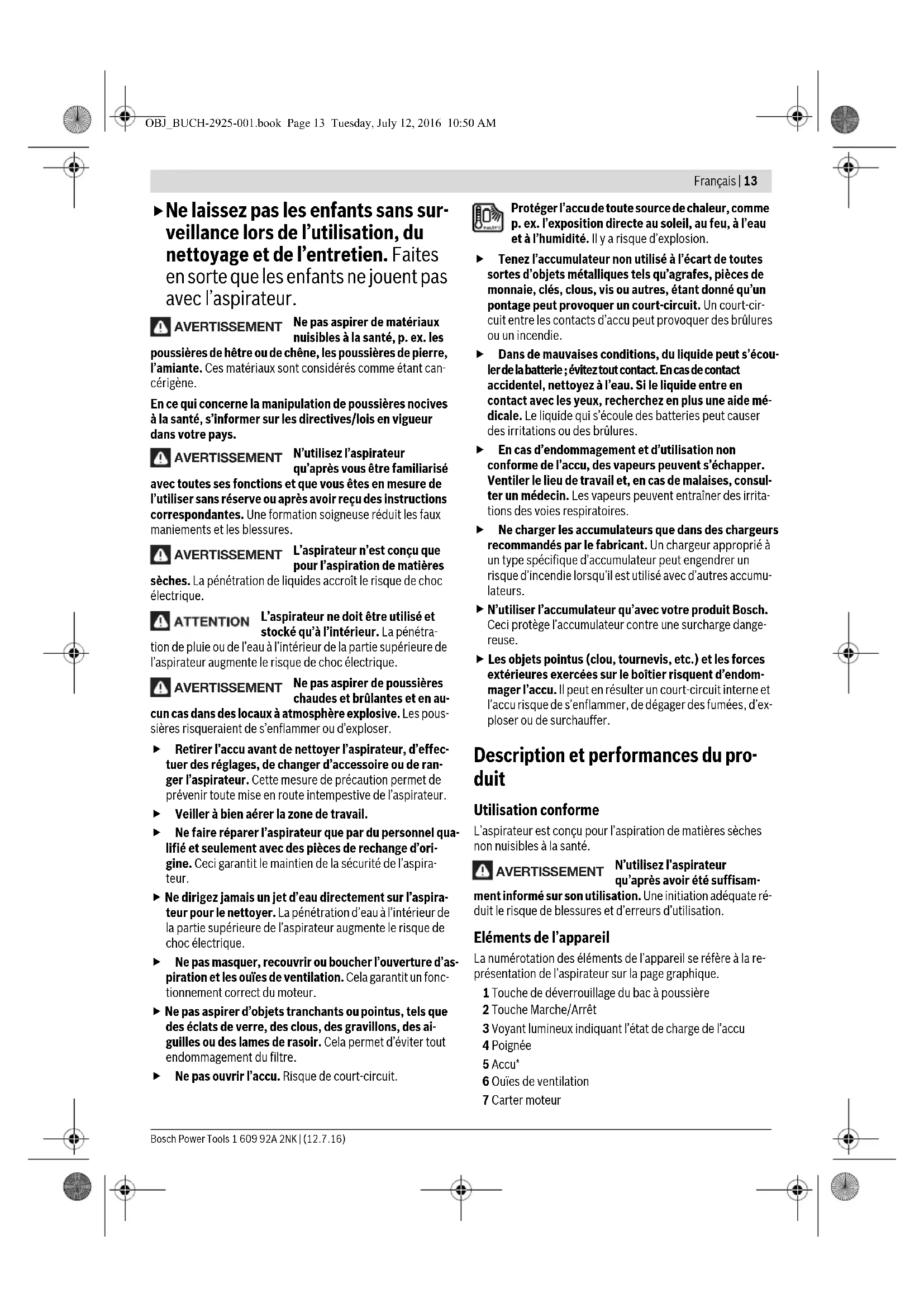 N’utiliser l’accumulateur qu’avec votre produit Bosch. Ceci protège l’accumulateur contre une surcharge dange- reuse. Les objets pointus (clou, tournevis, etc.) et les forces extérieures exercées sur le boîtier risquent d’endom- mager l’accu. Il peut en résulter un court-circuit interne et l’accu risque de s’enflammer, de dégager des fumées, d’ex- ploser ou de surchauffer. Description et performances du pro- duit Utilisation conforme L’aspirateur est conçu pour l’aspiration de matières sèches non nuisibles à la santé. N’utilisez l’aspirateur qu’après avoir été suffisam- ment informé sur son utilisation. Une initiation adéquate ré- duit le risque de blessures et d’erreurs d’utilisation. Eléments de l’appareil La numérotation des éléments de l’appareil se réfère à la re- présentation de l’aspirateur sur la page graphique. 1 Touche de déverrouillage du bac à poussière 2 Touche Marche/Arrêt 3 Voyant lumineux indiquant l’état de charge de l’accu 4 Poignée 5 Accu* 6 Ouïes de ventilation 7 Carter moteur AVERTISSEMENT AVERTISSEMENT AVERTISSEMENT AVERTISSEMENT AVERTISSEMENT OBJ_BUCH-2925-001.book Page 13 Tuesday, July 12, 2016 10:50 AM14 | Français 1 609 92A 2NK | (12.7.16) Bosch Power Tools 8 Bac à poussière 9 Buse suceur 10 Ouverture d’aspiration 11 Compartiment à accu 12 Touche de déverrouillage de l’accumulateur 13 Encoche 14 Joint de filtre 15 Filtre *Les accessoires décrits ou illustrés ne sont pas tous compris dans la fourniture. Vous trouverez les accessoires complets dans notre programme d’accessoires. Caractéristiques techniques Montage Chargement de l’accu N’utilisez que les chargeurs mentionnés à la page des accessoires. Seuls ces chargeurs sont adaptés à l’accu Li- thium-Ion de votre aspirateur. Note : L’accu est fourni en état de charge faible. Afin de garan- tir la puissance complète de l’accu, chargez complètement l’accu dans le chargeur avant la première mise en service. La batterie Lithium-ion peut être rechargée à tout moment, sans que sa durée de vie n’en soit réduite. Le fait d’inter- rompre le processus de charge n’endommage pas la batterie. Grâce à la Protection Electronique des Cellules « Electronic Cell Protection (ECP) », l’accu à ions lithium est protégé contre une décharge profonde. Lorsque l’accumulateur est déchargé, l’outil électroportatif s’arrête grâce à un dispositif d’arrêt de protection : L’outil de travail ne tourne plus. Après une désactivation automatique de l’aspirateur, ne pas essayer de le remettre en marche en actionnant l’interrupteur Marche/Arrêt. L’accu risquerait d’être en- dommagé. Respectez les indications concernant l’élimination. Voyant lumineux indiquant l’état de charge de l’accu Les trois LED vertes du voyant lumineux d’état de charge 3 in- diquent le niveau de charge de l’accu 5. Le voyant lumineux d’état de charge ne s’allume que pendant les 3 secondes qui suivent la mise en marche. Si aucune LED ne s’allume après la mise en marche, l’accu est défectueux, il faut le remplacer. Montage et démontage de l’accu (voir figures A1 – A2) Ne pas forcer pour insérer l’accu. L’accu est conçu de fa- çon à ne pouvoir être introduit dans l’aspirateur que dans la position correcte. –Insérez l’accu 5 jusqu’en butée dans le compartiment à ac- cu 11. – Pour retirer l’accumulateur 5, appuyez sur les touches de déverrouillage 12 de l’accumulateur et retirez ce dernier du compartiment à accu 11. Montage de la buse suceur (voir figure B) Retirer l’accu avant de nettoyer l’aspirateur, d’effec- tuer des réglages, de changer d’accessoire ou de ran- ger l’aspirateur. Cette mesure de précaution permet de prévenir toute mise en route intempestive de l’aspirateur. La buse suceur 9 peut être raccordée directement au bac à poussière 8. – Emboîter fermement la buse suceur 9 fermement dans l’ouverture d’aspiration 10 du bac à poussière 8 avec le marquage représenté sur la figure orienté vers le bas. Mise en marche Retirer l’accu avant de nettoyer l’aspirateur, d’effec- tuer des réglages, de changer d’accessoire ou de ran- ger l’aspirateur. Cette mesure de précaution permet de prévenir toute mise en route intempestive de l’aspirateur. Mise en service Avant d’aspirer, vérifiez que le filtre est correctement fixé. Assurez-vous que le filtre est en parfait état (sans fis- sures, petits trous, etc.). Remplacez aussitôt le filtre s’il est endommagé. Mise en marche/arrêt Afin d’économiser l’énergie, ne mettez en marche l’aspirateur que quand vous l’utilisez. –Pour mettre en marche l’aspirateur, actionnez la touche Marche / Arrêt 2. –Pour arrêter l’aspirateur, actionnez à nouveau la touche Marche / Arrêt 2. Aspirateur à sec sans fil GAS 12V N° d’article 3 601 JE3 0.. Volume du bac l0,4 Dépression max. hPa 45 Débit max. l/s 15 Poids suivant EPTA-Procedure 01:2014 kg 0,88 –1,1 Plage de températures autorisées –pendant la charge – pendant le fonctionnement