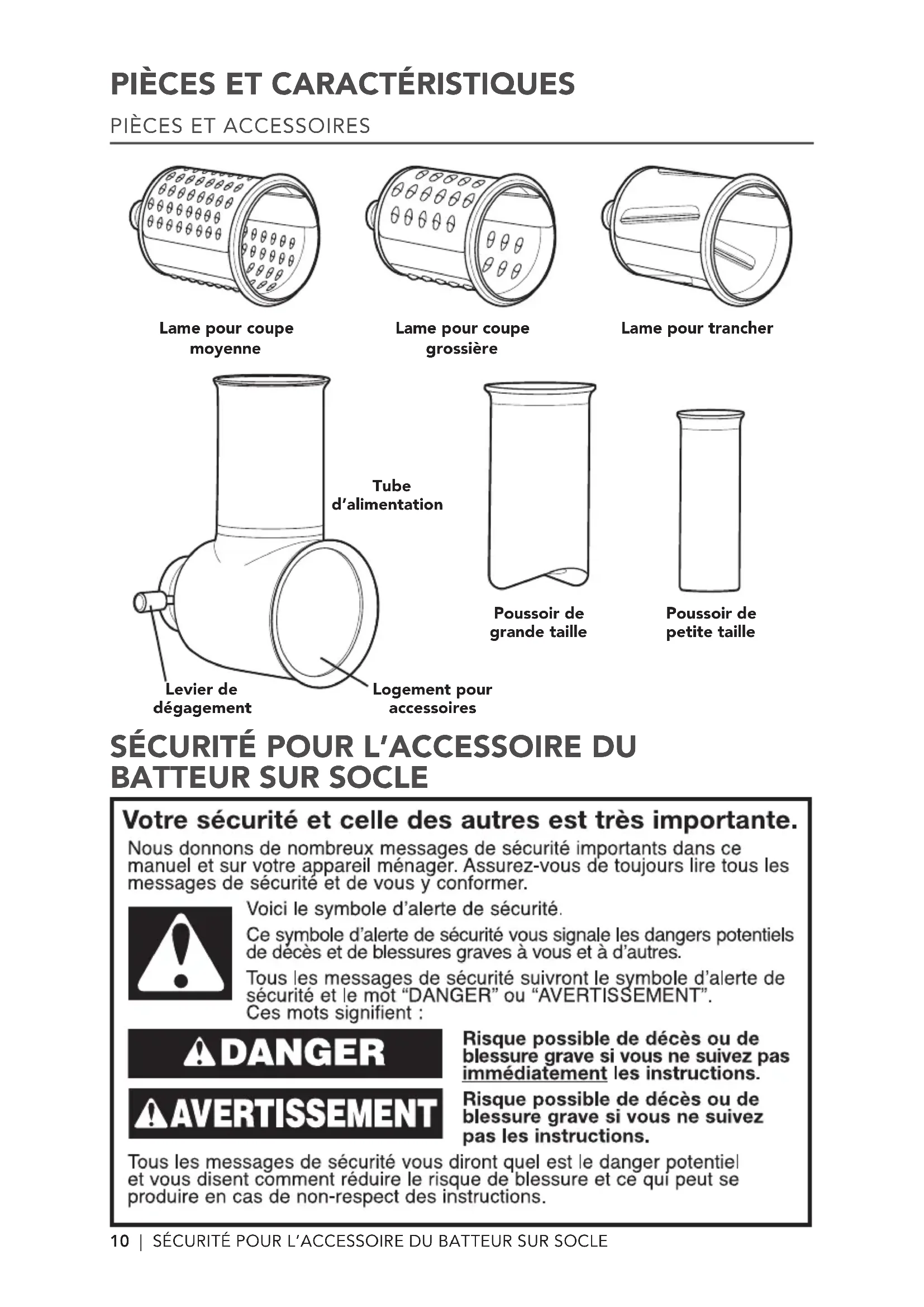 Lame pour coupe grossière Lame pour coupe moyenne Lame pour trancher Logement pour accessoires Levier de dégagement Tube d’alimentation Poussoir de petite taille Poussoir de grande taille W10916597A_FRv06.indd 10 11/4/16 2:12 PMSÉCURITÉ POUR L’ACCESSOIRE DU BATTEUR SUR SOCLE | 11 FRANÇAIS