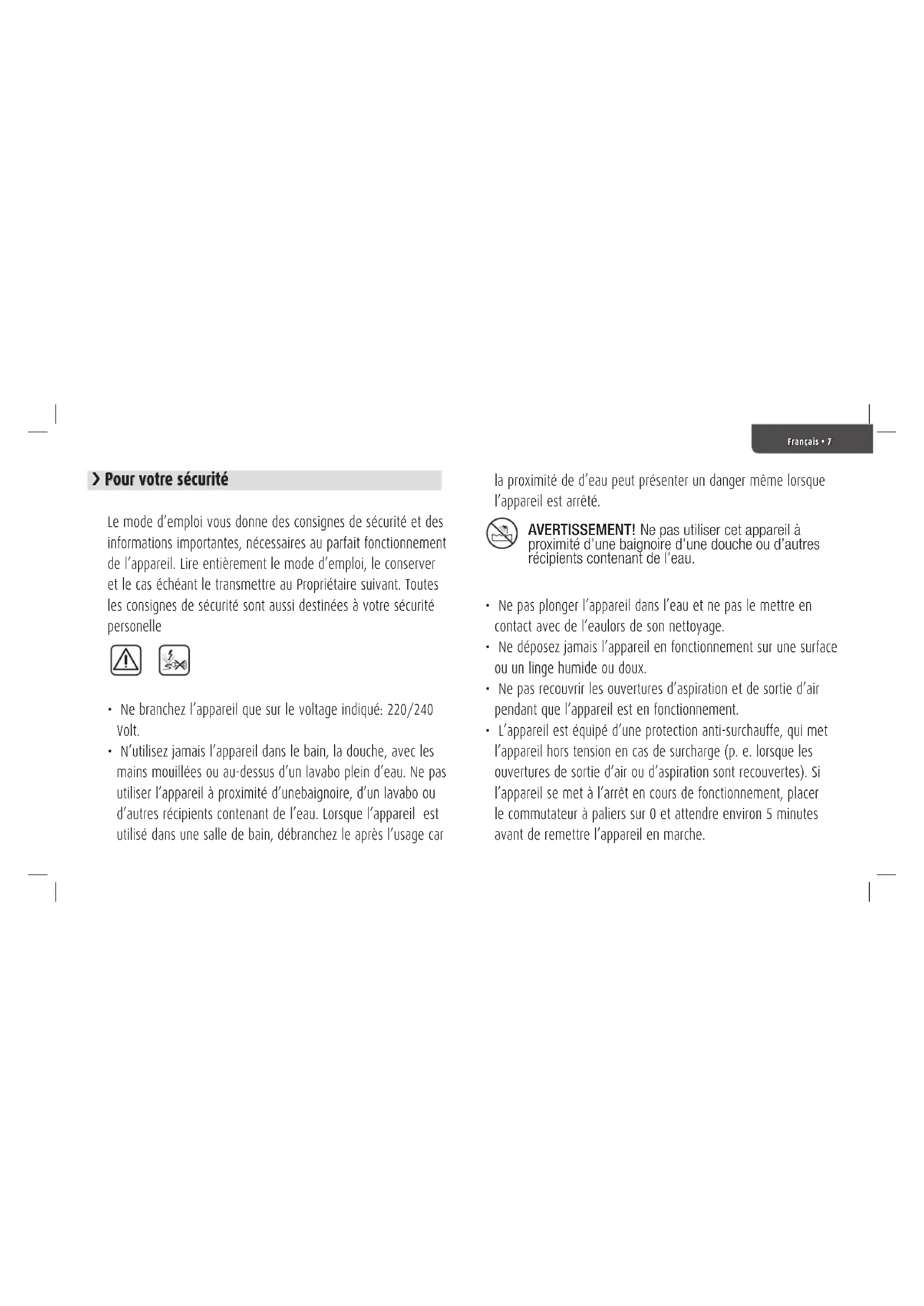 - Ne branchez l'appareil que sur le voltage indiqué: 220/240 Volt. N'utilisez jamais l'appareil dans le bain, la douche, avec les mains mouillées ou au-dessus d'un lavabo plein d'eau. Ne pas utiliser l'appareil à proximité d'une baignoire, d'un lavabo ou d'autres récipients contenant de l'eau. Lorsque l'appareil est utilisé dans une salle de bain, débranchez le après l'utilisation car
