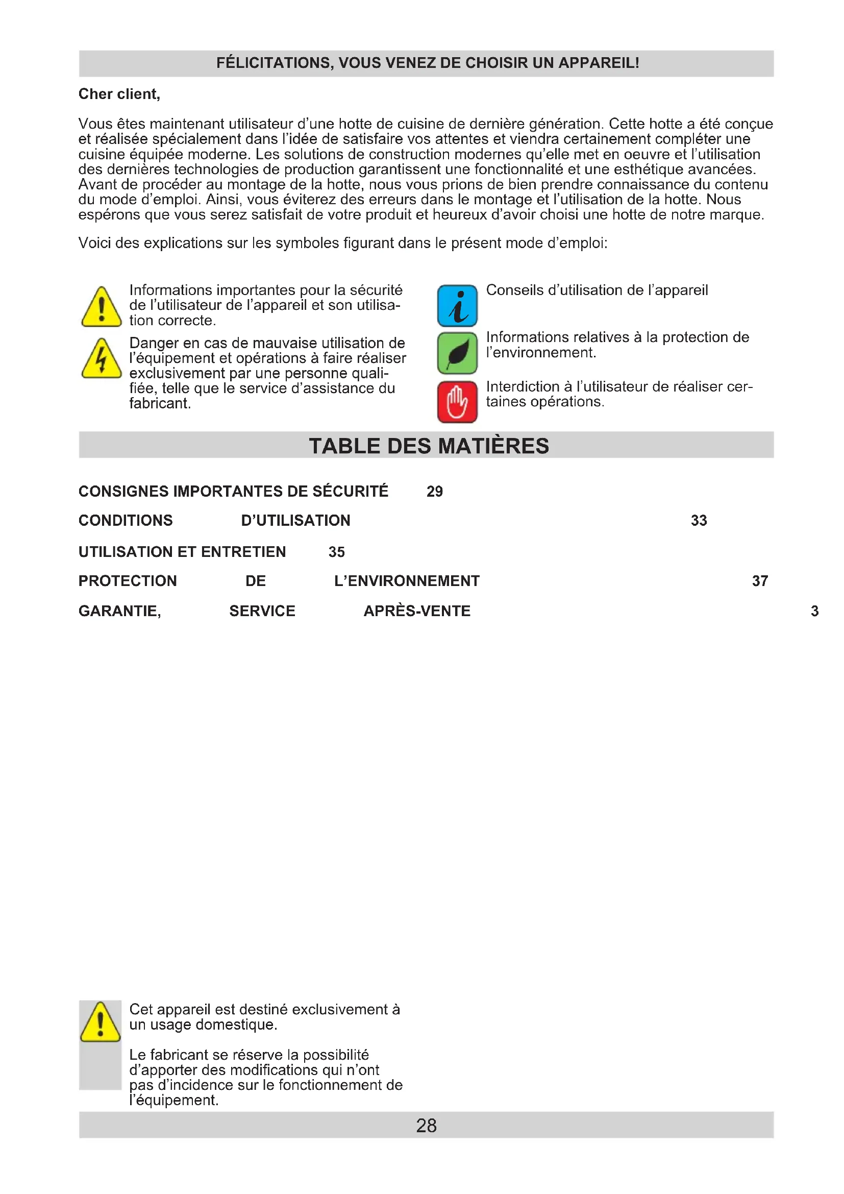 Cher client, Vous êtes maintenant utilisateur d’une hotte de cuisine de dernière génération. Cette hotte a été conçue et réalisée spécialement dans l’idée de satisfaire vos attentes et viendra certainement compléter une cuisine équipée moderne. Les solutions de construction modernes qu’elle met en oeuvre et l’utilisation des dernières technologies de production garantissent une fonctionnalité et une esthétique avancées. Avant de procéder au montage de la hotte, nous vous prions de bien prendre connaissance du contenu du mode d’emploi. Ainsi, vous éviterez des erreurs dans le montage et l’utilisation de la hotte. Nous espérons que vous serez satisfait de votre produit et heureux d’avoir choisi une hotte de notre marque. FÉLICITATIONS, VOUS VENEZ DE CHOISIR UN APPAREIL! Voici des explications sur les symboles gurant dans le présent mode d’emploi: Interdiction à l’utilisateur de réaliser cer- taines opérations. Danger en cas de mauvaise utilisation de l’équipement et opérations à faire réaliser exclusivement par une personne quali- ée, telle que le service d’assistance du fabricant. Informations importantes pour la sécurité de l’utilisateur de l’appareil et son utilisa- tion correcte. Conseils d’utilisation de l’appareil