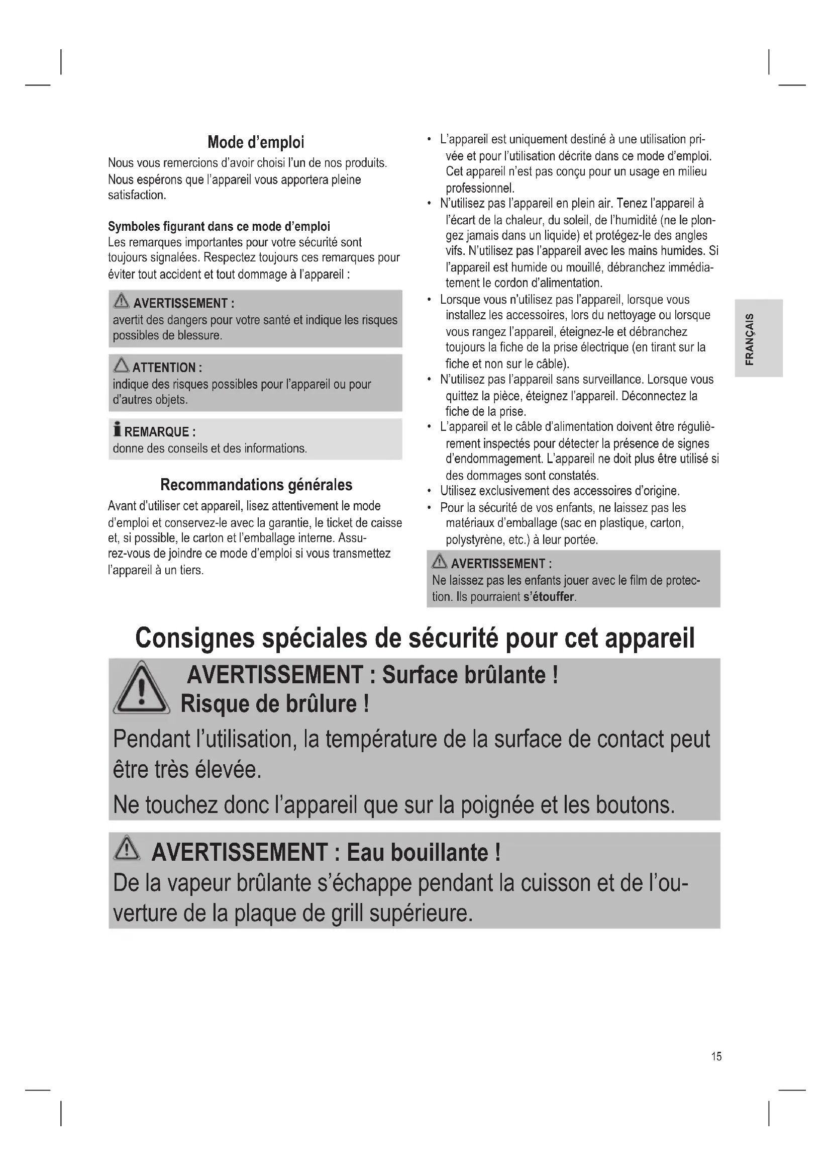 avertit des dangers pour votre santé et indique les risques possibles de blessure. ATTENTION : indique des risques possibles pour l’appareil ou pour d’autres objets. REMARQUE : donne des conseils et des informations. Recommandations générales Avant d’utiliser cet appareil, lisez attentivement le mode d’emploi et conservez-le avec la garantie, le ticket de caisse et, si possible, le carton et l’emballage interne. Assu- rez-vous de joindre ce mode d’emploi si vous transmettez l’appareil à un tiers.