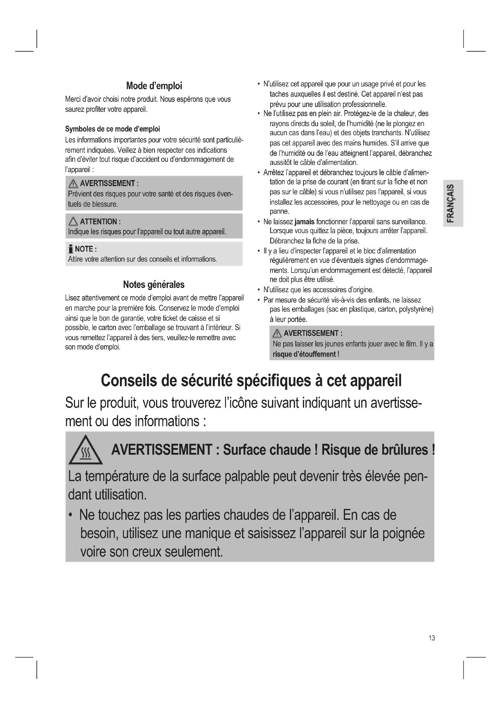 Prévient des risques pour votre santé et des risques éven- tuels de blessure. ATTENTION : Indique les risques pour l’appareil ou tout autre appareil. NOTE : Attire votre attention sur des conseils et informations. Notes générales Lisez attentivement ce mode d’emploi avant de mettre l’appareil en marche pour la première fois. Conservez le mode d’emploi ainsi que le bon de garantie, votre ticket de caisse et si possible, le carton avec l’emballage se trouvant à l’intérieur. Si vous remettez l’appareil à des tiers, veuillez-le remettre avec son mode d’emploi.