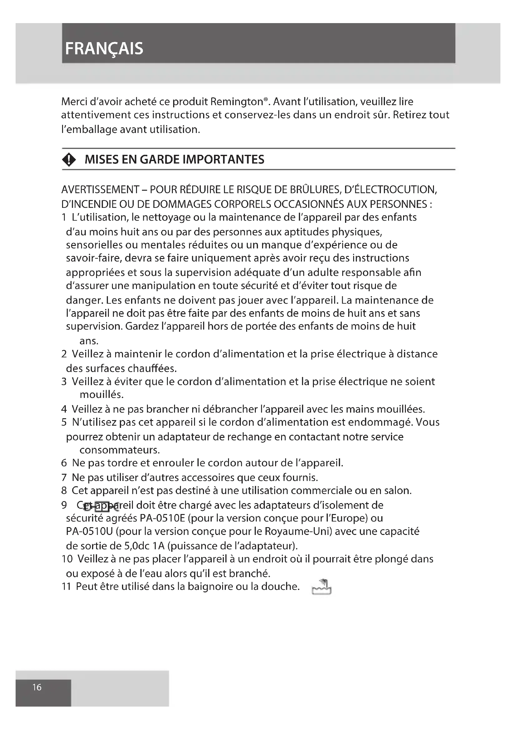 AVERTISSEMENT – POUR RÉDUIRE LE RISQUE DE BRÛLURES, D’ÉLECTROCUTION, D’INCENDIE OU DE DOMMAGES CORPORELS OCCASIONNÉS AUX PERSONNES : 1 L’utilisation, le nettoyage ou la maintenance de l’appareil par des enfants d’au moins huit ans ou par des personnes aux aptitudes physiques, sensorielles ou mentales réduites ou un manque d’expérience ou de savoir-faire, devra se faire uniquement après avoir reçu des instructions appropriées et sous la supervision adéquate d’un adulte responsable an d‘assurer une manipulation en toute sécurité et d’éviter tout risque de danger. Les enfants ne doivent pas jouer avec l’appareil. La maintenance de l’appareil ne doit pas être faite par des enfants de moins de huit ans et sans supervision. Gardez l’appareil hors de portée des enfants de moins de huit ans. 2 Veillez à maintenir le cordon d’alimentation et la prise électrique à distance des surfaces chauées. 3 Veillez à éviter que le cordon d’alimentation et la prise électrique ne soient mouillés. 4 Veillez à ne pas brancher ni débrancher l’appareil avec les mains mouillées. 5 N’utilisez pas cet appareil si le cordon d’alimentation est endommagé. Vous pourrez obtenir un adaptateur de rechange en contactant notre service consommateurs. 6 Ne pas tordre et enrouler le cordon autour de l’appareil. 7 Ne pas utiliser d’autres accessoires que ceux fournis. 8 Cet appareil n’est pas destiné à une utilisation commerciale ou en salon. 9 Cet appareil doit être chargé avec les adaptateurs d’isolement de sécurité agréés PA-0510E (pour la version conçue pour l’Europe) ou PA-0510U (pour la version conçue pour le Royaume-Uni) avec une capacité de sortie de 5,0dc 1A (puissance de l’adaptateur). 10 Veillez à ne pas placer l’appareil à un endroit où il pourrait être plongé dans ou exposé à de l’eau alors qu’il est branché. 11 Peut être utilisé dans la baignoire ou la douche. FRANÇAIS17
