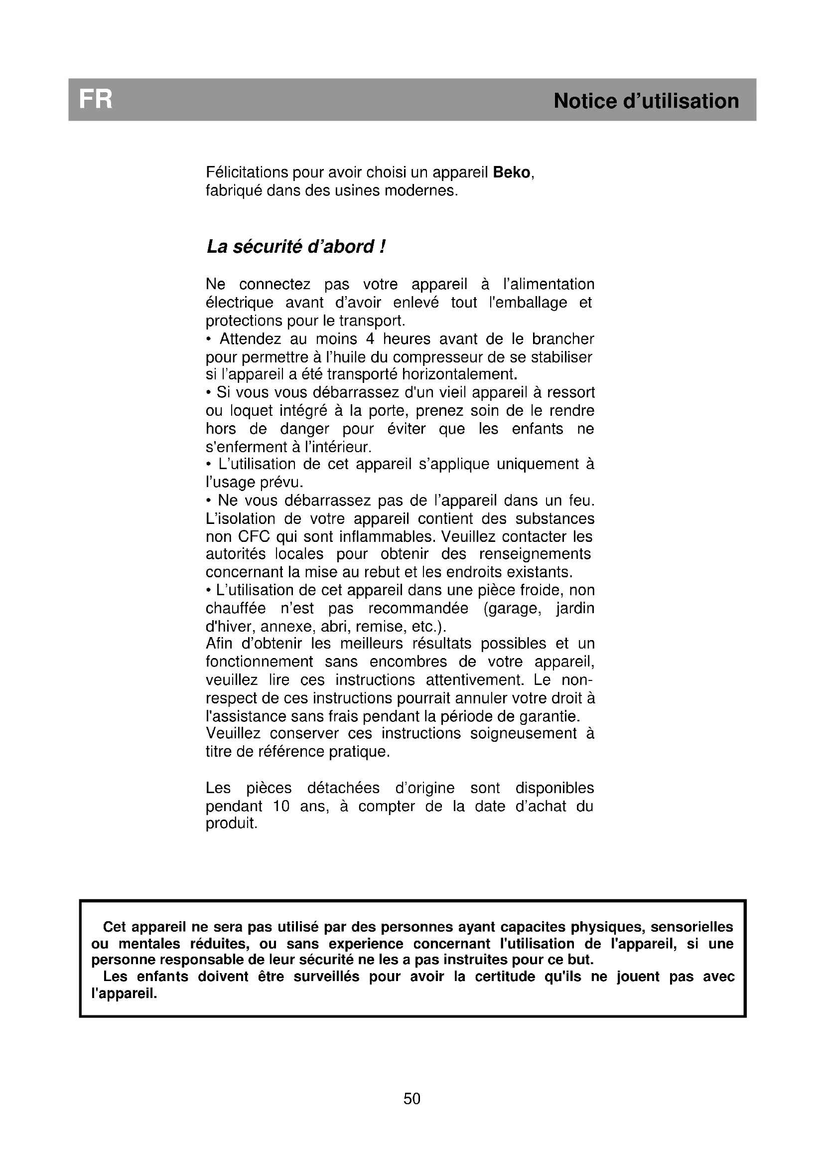 Cet appareil ne sera pas utilisé par des personnes ayant capacites physiques, sensorielles ou mentales réduites, ou sans experience concernant l'utilisation de l'appareil, si une personne responsable de leur sécurité ne les a pas instruites pour ce but. Les enfan ts doivent être surveillés pour avoir la certitude qu'ils ne jouent pas avec l'appareil.