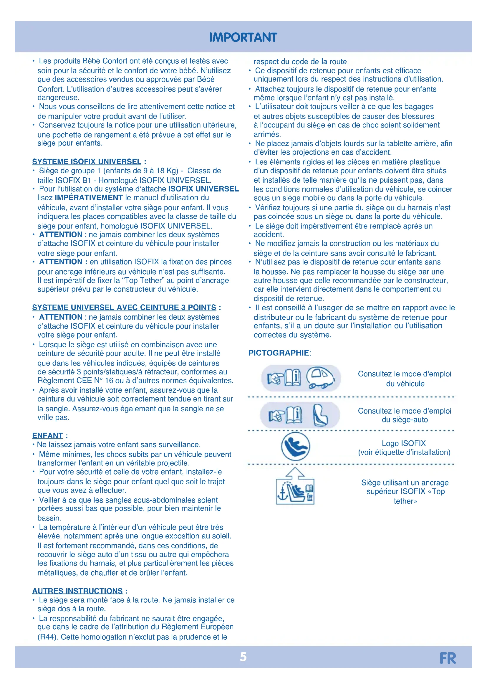 - Pour l’utilisation du système d’attache ISOFIX UNIVERSEL lisez IMPÉRATIVEMENT le manuel d’utilisation du véhicule, avant d’installer votre siège pour enfant. Il vous indiquera les places compatibles avec la classe de taille du siège pour enfant, homologué ISOFIX UNIVERSEL.