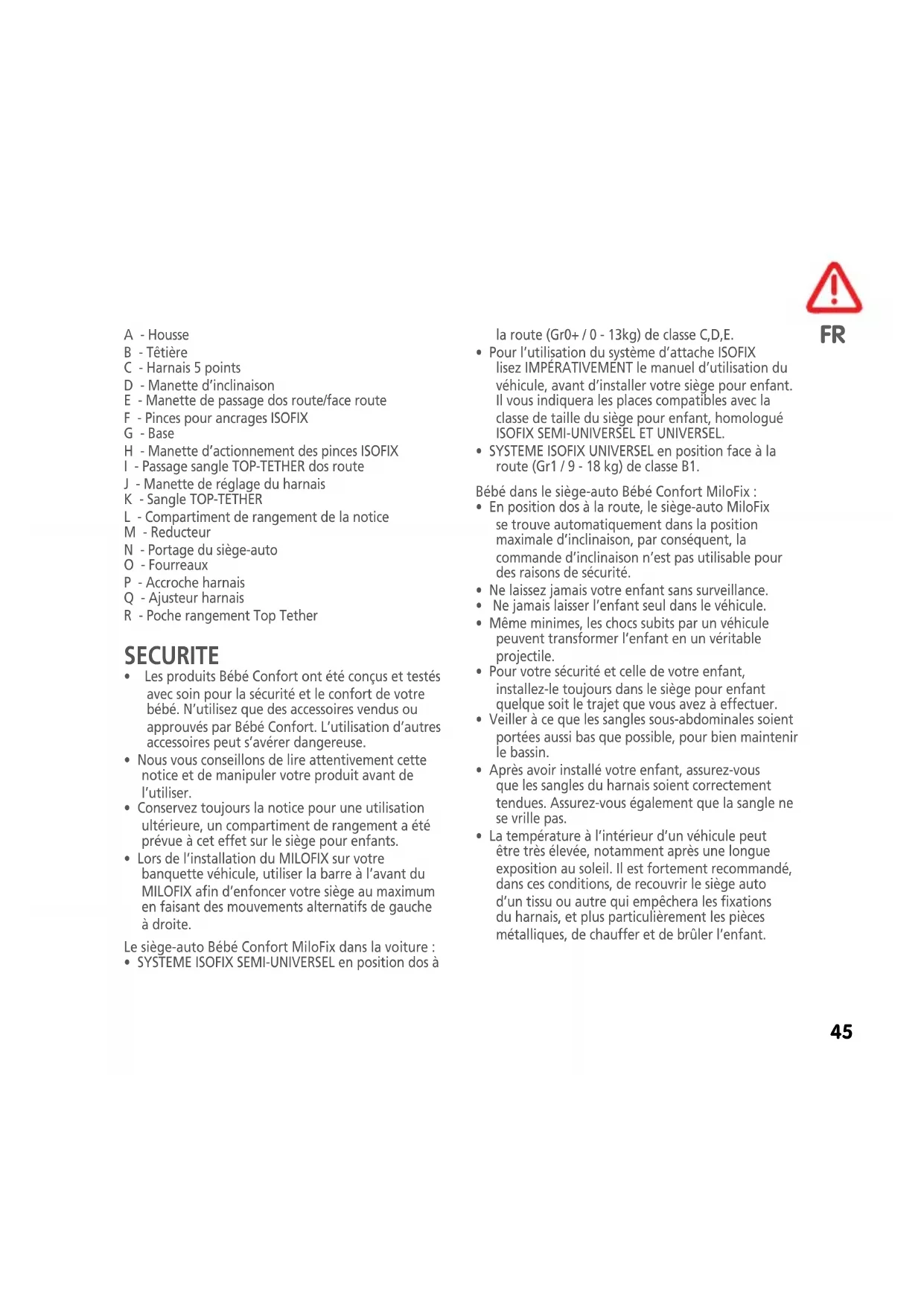 - Nettoyer la coque à l’aide d’un chiffon humide. Environnement Gardez le matériel d’emballage en plastique hors de la portée de votre enfant pour éviter les risques d’étouffement. Lorsque vous n’utilisez plus le produit, nous vous prions par souci de l’environnement de vous débarrasser du produit en faisant le tri des déchets et conformément à la législation locale en la matière. Questions Veuillez prendre contact avec votre distributeur local Bébé Confort ou visitez notre site web www.bebeconfort.com. Veillez à avoir les informations suivantes sous la main : - Numéro de série; - L’âge (la taille) et le poids de votre enfant. Garantie Notre garantie de 24 mois reflète notre confiance dans la qualité supérieure de notre conception, ingénierie, production et la performance du produit. Nous garantissons que ce produit a été fabriqué conformément aux exigences de sécurité et normes de qualité actuelles européennes applicables à ce produit, et que ce produit est, au moment de l’achat, exempt de défaut de matériau et de fabrication. Dans les conditions mentionnés dans ce document, cette garantie peut être invoquée par les consommateurs dans les pays où ce produit a été vendu par une filiale du groupe Dorel ou par un revendeur ou détaillant autorisé. Notre garantie de 24 mois couvre tous les défauts de matériau et de fabrication pour une utilisation dans des conditions normales et conformément à la notice pour une période de 24 mois à compter de la date de l’achat initial par le premier client utilisateur. Pour demander des réparations ou des pièces de rechange sous garantie pour des défauts de matériau et de fabrication, vous devez présenter la preuve d’un achat effectué dans les 24 mois précédant la demande de service. Notre garantie de 24 mois ne couvre pas les dommages causés par l’usure normale, les accidents, l’utilisation abusive, la négligence, le feu, le contact avec un liquide ou toute autre cause extérieure, les dommages résultant d’une utilisation non conforme au mode d’emploi, de l’utilisation avec un autre produit, d’une réparation ou d’un entretien mené par une personne non autorisée par nos services, les produits volés, ne FR48 portant plus l’étiquette ou le numéro d’identification ou les produits dont ce numéro a été modifié. Des exemples d’usure normale comprennent : des roues et des tissus usés par l’utilisation régulière et la décoloration et la décomposition naturelle de couleurs et des matériaux dus à la vétusté du produit. Que faire en cas de défauts : Si des problèmes ou des défauts surviennent, le meilleur choix pour un service rapide est de consulter un revendeur agréé par nos services. Notre garantie de 24 mois est reconnue par ceux-ci (1) . Vous devez présenter la preuve d’un achat effectué dans les 24 mois précédant la demande de service. Cela est plus facile si vous obtenez l’approbation au préalable de votre demande auprès de nos services. Si vous soumettez une réclamation valide en vertu de cette garantie, nous pouvons vous demander de retourner votre produit au distributeur agréé ou de nous envoyer le produit conformément à nos instructions. Nous payerons les frais d’envoi et de retour si toutes les instructions sont correctement suivies. Les dommages et/ou défauts qui ne sont couverts ni par notre garantie ni par les droits légaux du consommateur et/ou les dommages et/ou défauts en rapport à des produits qui ne sont pas couverts par notre garantie peuvent être traités à un tarif raisonnable. Droits du consommateur : Un consommateur a des droits légaux, en vertu de la législation applicable à la consommation, qui peuvent varier d’un pays à l’autre. Les droits du consommateur en vertu de la législation nationale applicable ne sont pas affectés par cette garantie. Garantie à vie : Bébé Confort offre aux utilisateurs initiaux une Garantie à vie fabricant volontaire soumise aux conditions générales publiées sur notre site Web : www.bebeconfort.com/lifetimewarranty. Pour demander cette Garantie à vie vous devez vous inscrire sur notre site Web. Cette garantie est fournie par Dorel Pays-Bas. Nous sommes enregistrés aux Pays-Bas sous le numéro d’entreprise 17060920. Notre adresse commerciale est Korendijk 5, 5704 RD Helmond, Pays-Bas, et notre adresse postale est P.O. Box 6071, 5700 ET Helmond, Pays-Bas. Vous pouvez trouver les noms et les adresses des autres filiales du groupe Dorel à la dernière page de ce manuel et sur notre site Web pour la marque concernée. (1) Les produits achetés auprès de détaillants ou de revendeurs qui ôtent ou changent les étiquettes ou les numéros d’identifications sont considérés comme non autorisés. Les produits achetés auprès de revendeurs non autorisés sont également considérés comme non autorisés. Aucune garantie ne s’applique à ces produits puisque leur authenticité ne peut pas être vérifiée. FR49 A - Bezug B - Kopfstütze C - 5-Punkt-Gurt D - Neigbarer Griff E - Griff zur Einstellung entgegen Fahrtrichtung/in Fahrtrichtung F - Fangarme zum Einrasten der Isofix-Verbindung G - Basis H - Aktuator der ISOFIX-Fangarme I - Führung des Zusatzgurtes TOP-TETHER entgegen der Fahrtrichtung J - Kopfstützen-Einstellung K - Zusatzgurt TOP-TETHER L - Fach zum Aufbewahren der Gebrauchsanleitung M - Einlegekissen für Neugeborene N - Tragen des Autositzes O - Schulterpolster P - Gurtschnallen Q - Gurteinstellung R - Tasche zum Verstauen des Top Tether Gurts SICHERHEIT