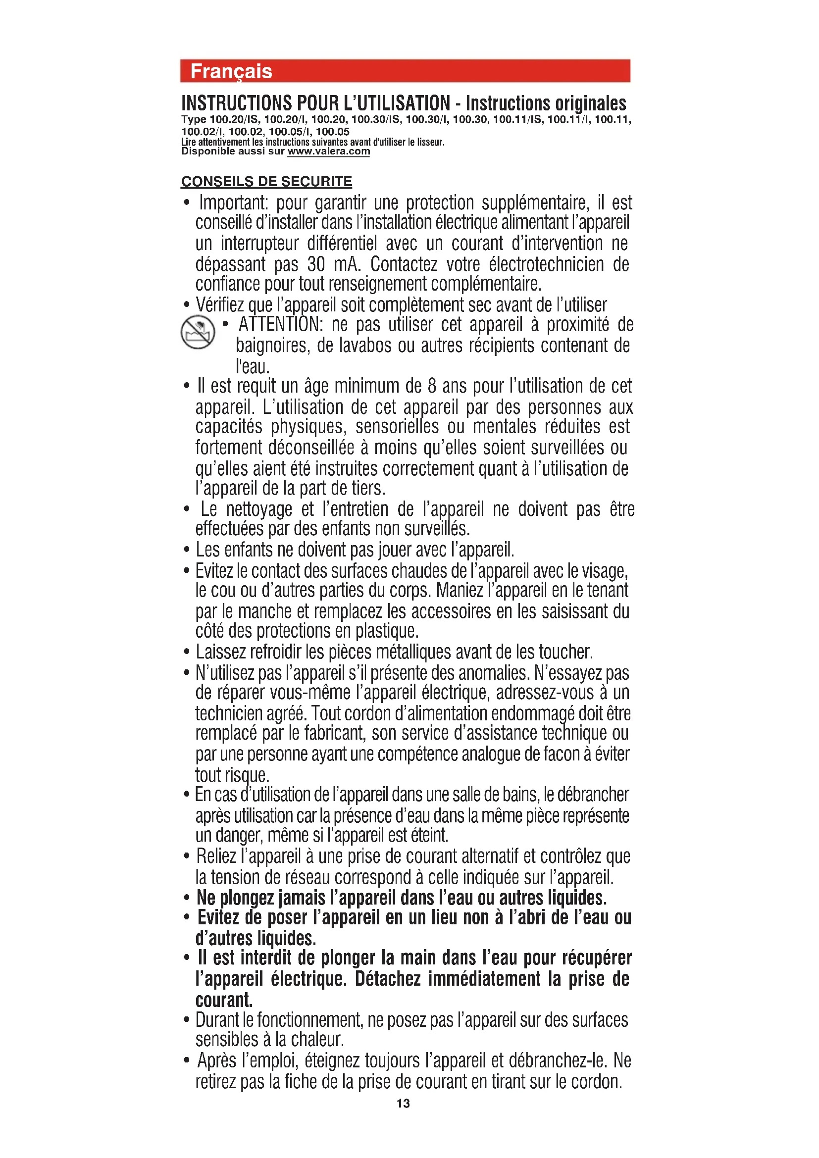 personnes non autorisées. En cas de panne, renvoyer l’appareil correctement emballé avec le certificat de garantie correctement daté et timbré par le vendeur à l’un de nos Centres d’Assistance agréés ou au magasin d’achat qui l’enverra à l’importateur officiel pour la réparation sous garantie. VALERA est une marque enregistrée par Ligo Electric S.A. - Suisse Le symbole sur le produit ou son emballage indique que ce produit ne peut être traité comme déchet ménager. Il doit être remis au point de collecte prévu à cet effet (collecte et recyclage du matériel électrique et électronique). En procédant à la mise à la casse réglementaire de l’appareil, nous préservons l’environnement et notre sécurité, s’assurant ainsi que le déchets seront traités dans des conditions appropriées. Pour obtenir plus de détails sur le recyclage de ce produit, veuillez prendre contact avec les services de votre commune ou le magasin où vous avez effectué l’achat. 00060714 int_mar2017:Layout 1 07/03/2017 9.20 Pagina 1516 Italiano ISTRUZIONI PER L’USO - Istruzioni originali Type 100.20/IS, 100.20/I, 100.20, 100.30/IS, 100.30/I, 100.30, 100.11/IS, 100.11/I, 100.11, 100.02/I, 100.02, 100.05/I, 100.05 Leggere attentamente queste istruzioni prima di utilizzare l’apparecchio - Disponibili anche su www.valera.com