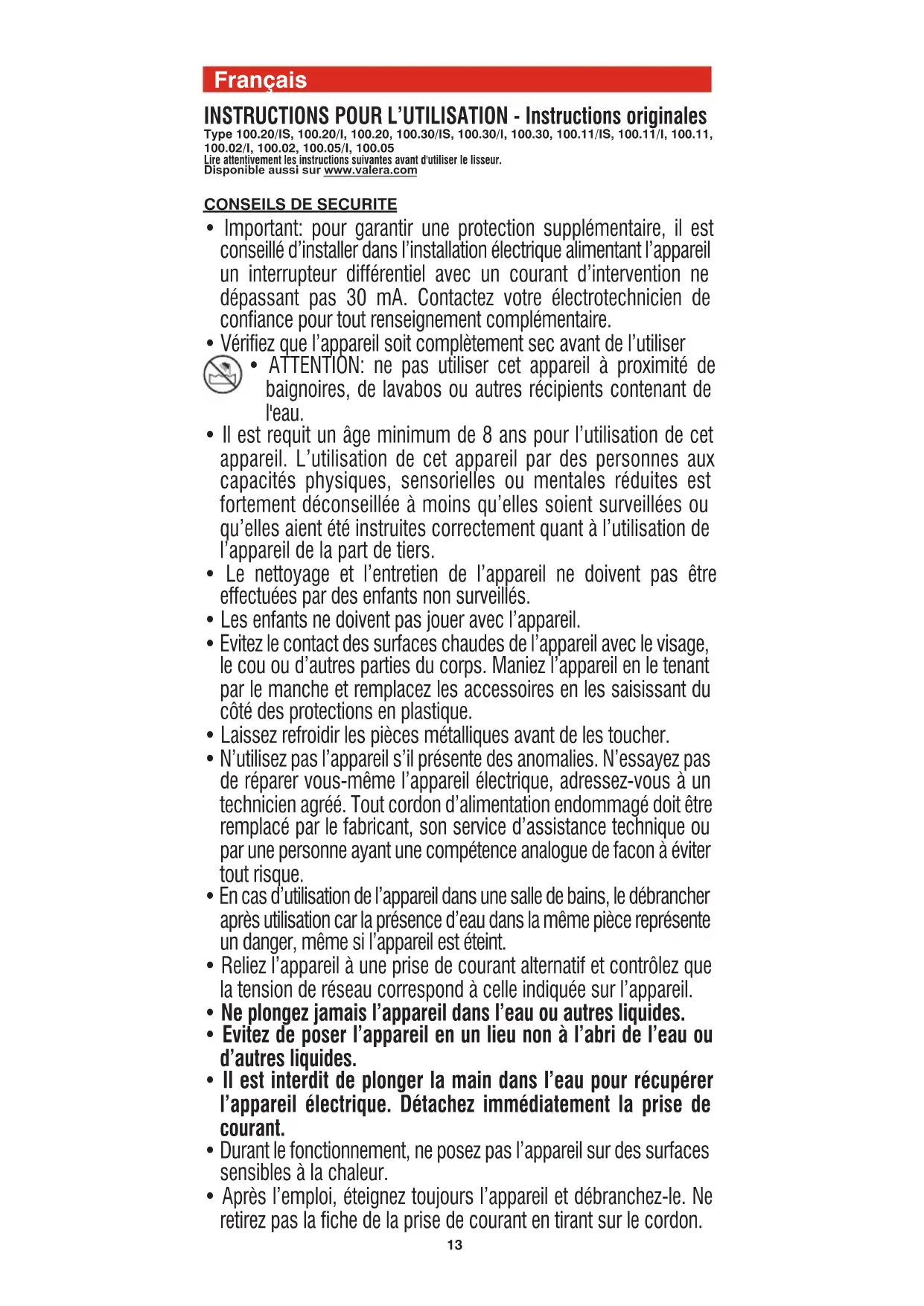 - Il est interdit de plonger la main dans l’eau pour récupérer l’appareil électrique. Détachez immédiatement la prise de courant.