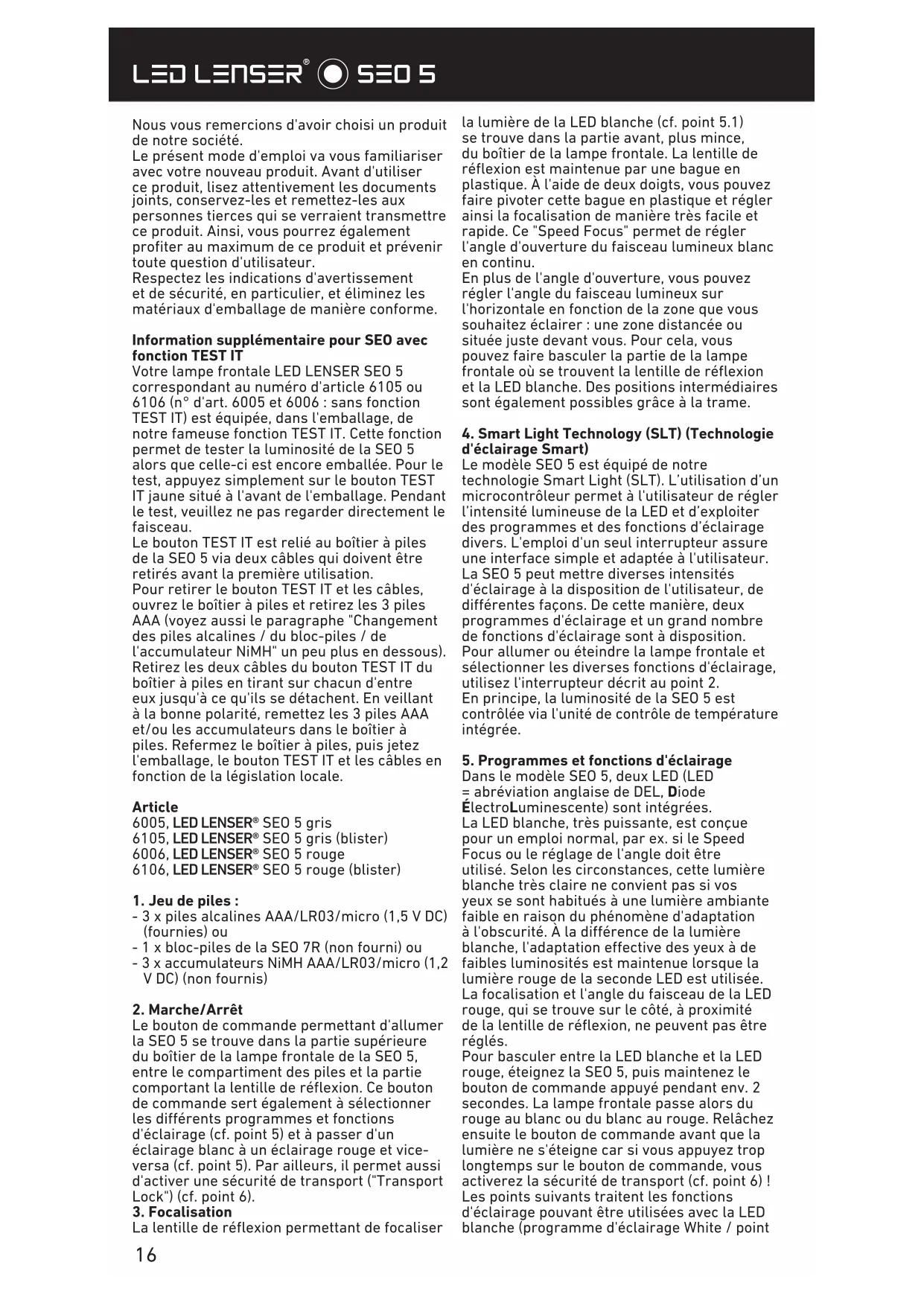 Nous vous remercions d'avoir choisi un produit de notre société. Le présent mode d'emploi va vous familiariser avec votre nouveau produit. Avant d'utiliser ce produit, lisez attentivement les documents joints, conservez-les et remettez-les aux personnes tierces qui se verraient transmettre ce produit. Ainsi, vous pourrez également profiter au maximum de ce produit et prévenir toute question d'utilisateur. Respectez les indications d'avertissement et de sécurité, en particulier, et éliminez les matériaux d'emballage de manière conforme. Information supplémentaire pour SEO avec fonction TEST IT Votre lampe frontale LED LENSER SEO 5 correspondant au numéro d'article 6105 ou 6106 (n° d'art. 6005 et 6006 : sans fonction TEST IT) est équipée, dans l'emballage, de notre fameuse fonction TEST IT. Cette fonction permet de tester la luminosité de la SEO 5 alors que celle-ci est encore emballée. Pour le test, appuyez simplement sur le bouton TEST IT jaune situé à l'avant de l'emballage. Pendant le test, veuillez ne pas regarder directement le faisceau. Le bouton TEST IT est relié au boîtier à piles de la SEO 5 via deux câbles qui doivent être retirés avant la première utilisation. Pour retirer le bouton TEST IT et les câbles, ouvrez le boîtier à piles et retirez les 3 piles AAA (voyez aussi le paragraphe "Changement des piles alcalines / du bloc-piles / de l'accumulateur NiMH" un peu plus en dessous). Retirez les deux câbles du bouton TEST IT du boîtier à piles en tirant sur chacun d'entre eux jusqu'à ce qu'ils se détachent. En veillant à la bonne polarité, remettez les 3 piles AAA et/ou les accumulateurs dans le boîtier à piles. Refermez le boîtier à piles, puis jetez l'emballage, le bouton TEST IT et les câbles en fonction de la législation locale. Article 6005, LED LENSER® SEO 5 gris 6105, LED LENSER® SEO 5 gris (blister) 6006, LED LENSER® SEO 5 rouge 6106, LED LENSER® SEO 5 rouge (blister)