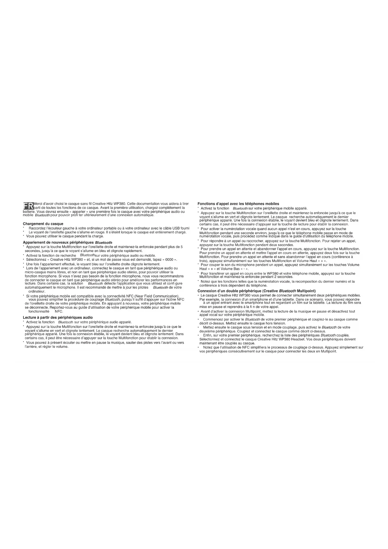 Activez la fonction Bluetooth sur votre périphérique mobile apparié. Appuyez sur la touche Multifonction sur l’oreillette droite et maintenez-la enfoncée jusqu’à ce que le voyant s’allume en vert et clignote lentement. Le casque recherche automatiquement le dernier périphérique apparié. Une fois la connexion établie, le voyant devient bleu et clignote lentement. Dans certains cas, il peut être nécessaire d’appuyer sur la touche de lecture pour établir la connexion. Pour activer la numérotation vocale quand aucun appel n’est en cours, appuyez sur la touche Multifonction pendant une seconde environ, jusqu’à ce que le téléphone mobile passe en mode de numérotation vocale, puis procédez comme indiqué dans le guide d’utilisation du téléphone mobile. Pour répondre à un appel ou raccrocher, appuyez sur la touche Multifonction. Pour rejeter un appel, appuyez sur la touche Multifonction pendant deux secondes. Pour prendre un appel en attente et abandonner l’appel en cours, appuyez sur la touche Multifonction. Pour prendre un appel en attente et mettre l’appel en cours en attente, appuyez deux fois sur la touche Multifonction. Pour prendre un appel en attente et sans abandonner l’appel en cours (conférence à trois), appuyez simultanément sur les touches Multifonction et Volume Haut « + ». Pour couper le son du microphone pendant un appel, appuyez simultanément sur les touches Volume Haut « + » et Volume Bas « - ». Pour transférer un appel en cours entre le WP380 et votre téléphone mobile, appuyez sur la touche Multifonction et maintenez-la enfoncée pendant 2 secondes. Notez que les fonctions telles que la numérotation vocale, la recomposition du dernier numéro et la conférence à trois dépendent du téléphone. Connexion d’un double périphérique (Creative Bluetooth Multipoint)