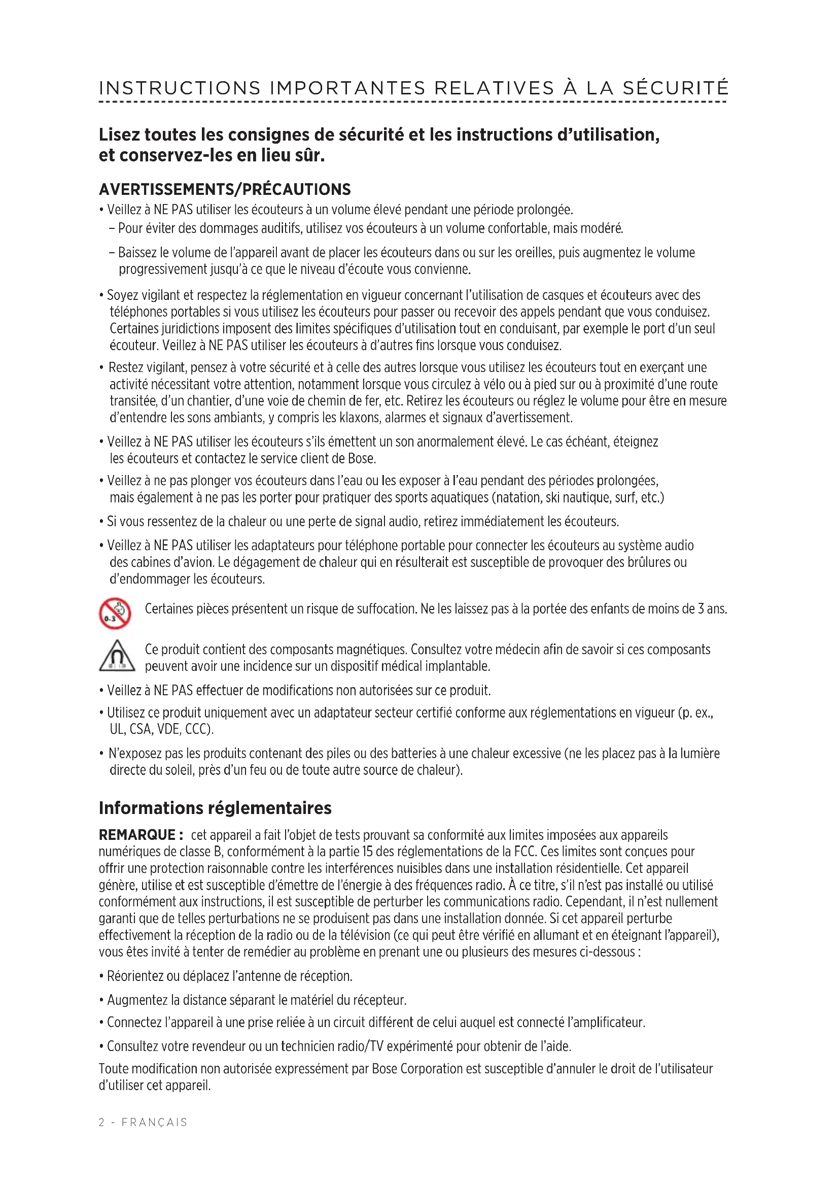 - Consultez votre revendeur ou un technicien radio/TV expérimenté pour obtenir de l’aide. Toute modification non autorisée expressément par Bose Corporation est susceptible d’annuler le droit de l’utilisateur d’utiliser cet appareil. INSTRUCTIONS IMPORTANTES RELATIVES À LA SÉCURITÉFRANÇAIS - 3