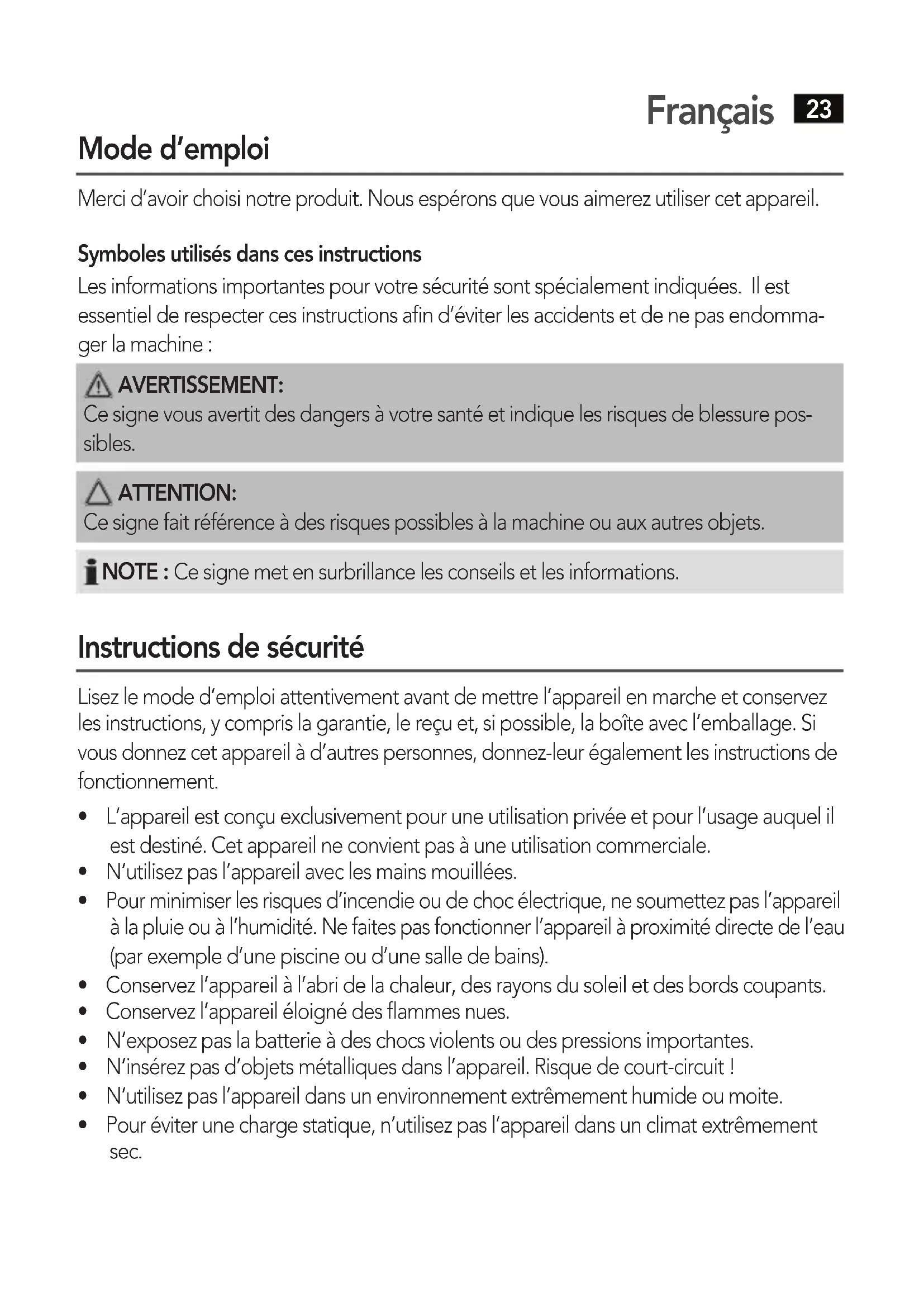 Ce signe vous avertit des dangers à votre santé et indique les risques de blessure pos- sibles. ATTENTION: Cesignefaitréférenceàdesrisquespossiblesàlamachineouauxautresobjets. NOTE : Ce signe met en surbrillance les conseils et les informations. Instructions de sécurité Lisez le mode d’emploi attentivement avant de mettre l’appareil en marche et conservez les instructions, y compris la garantie, le reçu et, si possible, la boîte avec l’emballage. Si vous donnez cet appareil à d’autres personnes, donnez-leur également les instructions de fonctionnement.