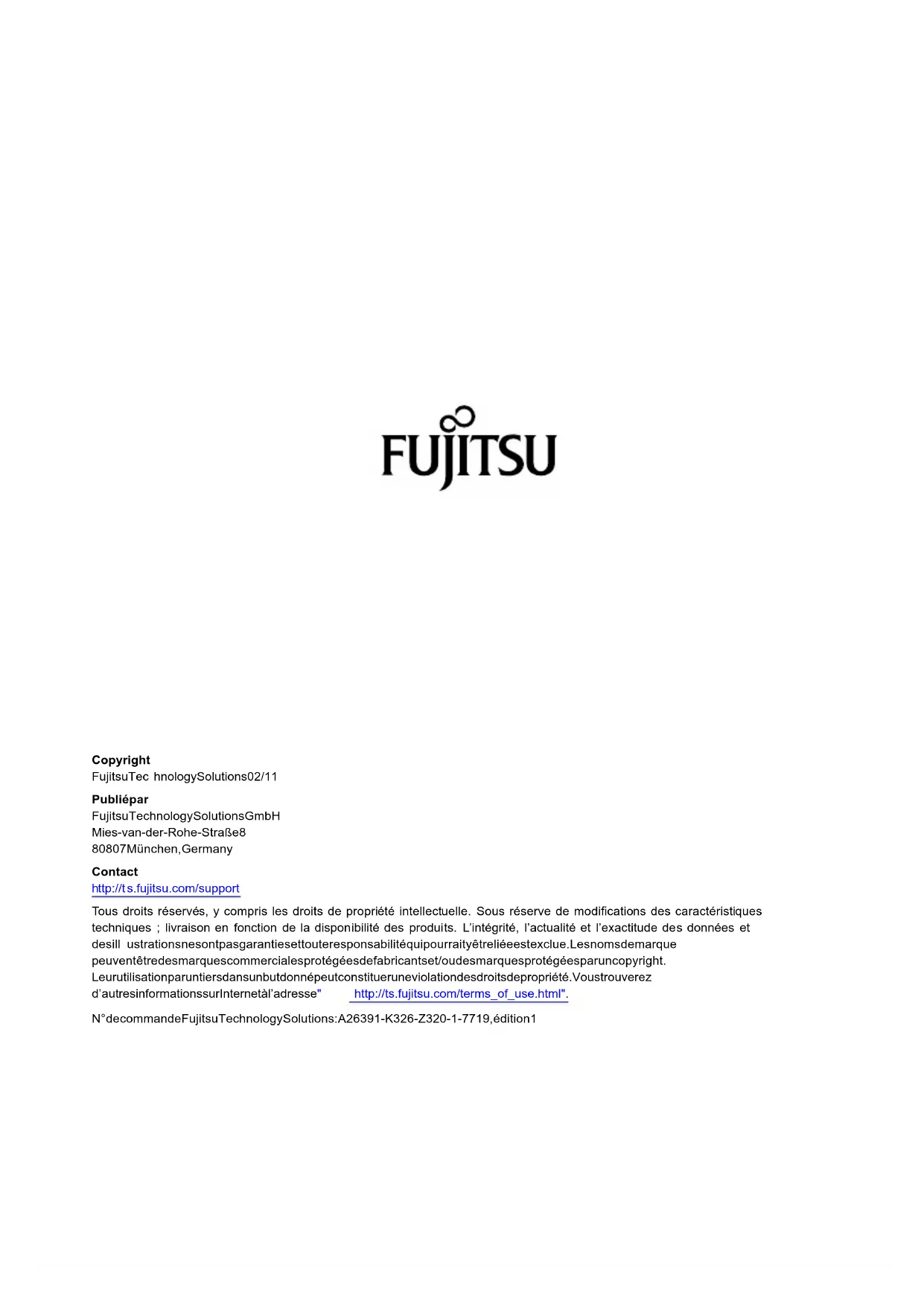 - votre point de vente Nous vous souhaitons beaucoup de plaisir avec votre nouveau système Fujitsu.Copyright Fujitsu Tec hnology Sol utions 02/11 Publié p ar Fujitsu Technology Solutions GmbH Mies-van- der-Rohe-Straße 8 80807 München, Germany Contact