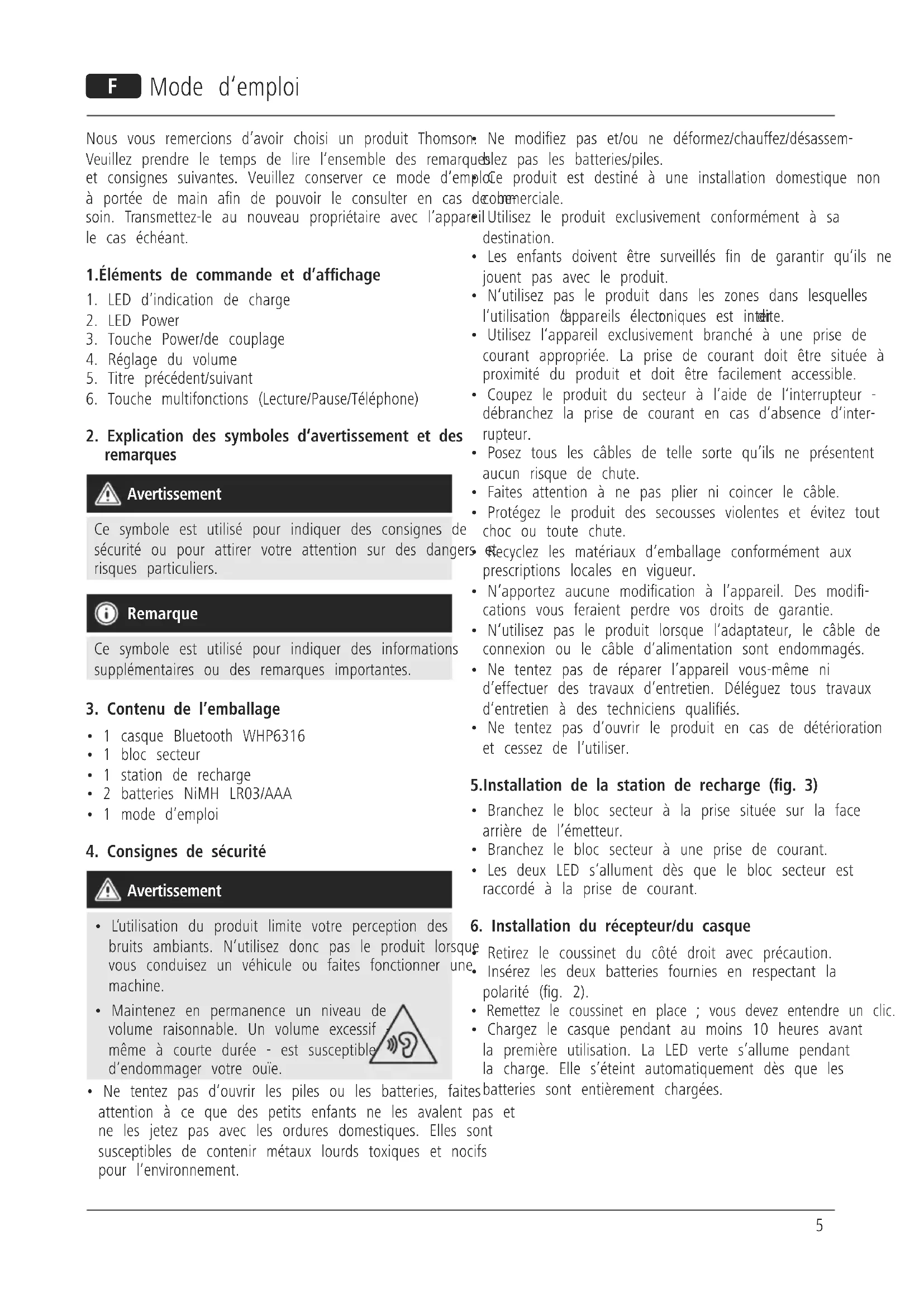 Nous vous remercions d'avoir choisi un produit Thomson. Ne modifie pas et/ou ne déformez/chauffez/désassem-Veuillez prendre le temps de dire l'ensemble des remarqueslez pas les batteries/piles.