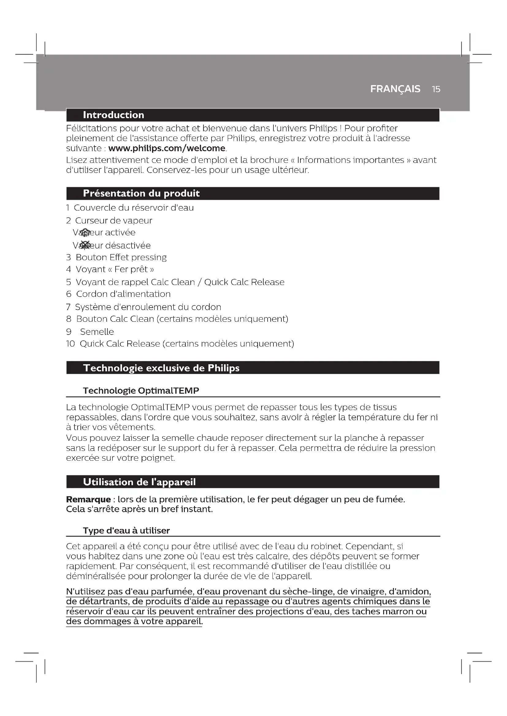 Problème Cause possible Solution La housse de la planche à repasser devient humide ou des gouttes d'eau apparaissent sur le vêtement pendant le repassage. La vapeur s'est condensée sur la housse de la planche à repasser après une longue séance de repassage. Remplacez la housse de la planche à repasser si la mousse est usée. Vous pouvez ajouter une couche de feutre sous la housse de la planche à repasser pour empêcher la condensation sur la planche à repasser. Vous pouvez acheter le feutre dans un magasin de tissu. Votre housse de planche à repasser n'est pas conçue pour résister au débit élevé de vapeur de l'appareil. Mettez une couche supplémentaire de feutre sous la housse de la planche à repasser pour empêcher la condensation sur la planche à repasser. Vous pouvez acheter le feutre dans un magasin de tissu. Des gouttes d'eau tombent sur le vêtement lors du repassage. La fonction Eet pressing a été utilisée trop souvent pendant une courte période. Continuez à utiliser le fer en position horizontale et patientez quelques instants avant d'utiliser de nouveau la fonction Eet pressing. Vous n'avez pas fermé le couvercle du réservoir d'eau correctement. Appuyez sur le couvercle jusqu'à ce que vous entendiez un clic. Vous n'avez pas réinséré correctement le récepteur Quick Calc Release dans l'appareil (certains modèles uniquement). Arrêtez le repassage et laissez le fer à repasser refroidir pendant au moins 1 heure. Retirez le récepteur Quick Calc Release. Réinsérez-le dans l'appareil et assurez-vous que le récepteur est aligné avec la surface de l'appareil. Abaissez le levier (« clic »). Si le récepteur Quick Calc Release est endommagé, contactez le Service Consommateurs de votre pays (voir le dépliant de garantie internationale pour les coordonnées). Le fer ne produit pas de jet de vapeur. La fonction Eet pressing a été utilisée trop souvent pendant une courte période. Continuez à utiliser le fer en position horizontale et patientez quelques instants avant d'utiliser de nouveau la fonction Eet pressing. Le fer à repasser n'a pas susamment chaué pour le repassage. Patientez jusqu'à ce que le voyant « Fer prêt » cesse de clignoter et s'allume de manière continue. Vous avez ajouté un produit chimique dans le réservoir d'eau. Rincez le réservoir d'eau et ne mettez aucun parfum ni produit chimique dans le réservoir d'eau. De l'eau sale et des impuretés s'écoulent de la semelle pendant le repassage. De l'eau calcaire avec des impuretés ou produits chimiques a formé des dépôts calcaires dans la semelle. Exécutez la fonction Quick Calc Release (certains modèles uniquement) ou Calc Clean (certains modèles uniquement). Voir le chapitre « Nettoyage et entretien ». De l'eau s'écoule de la semelle après que le fer à repasser a été débranché. Vous avez peut-être rangé le fer en position horizontale alors que le réservoir n'était pas vide. Videz le réservoir d'eau après utilisation ou rangez le fer à repasser en position verticale. Le curseur de vapeur est réglé sur . Réglez le curseur de vapeur sur . Un voyant clignote en orange sur la poignée du fer à repasser. Le voyant de rappel Calc Clean est activé. Il vous rappelle de procéder au détartrage. Exécutez la fonction Quick Calc Release (certains modèles uniquement) ou Calc Clean (certains modèles uniquement). Voir le chapitre « Nettoyage et entretien ». Le fer laisse un voile ou une marque sur le vêtement. La surface à repasser était non plane, par exemple parce que vous repassiez sur une couture ou un pli dans le vêtement. Le fer à repasser peut être utilisé en toute sécurité sur tous les vêtements repassables. Les traces lustrées ne sont pas permanentes et disparaissent au lavage. Évitez de repasser sur les coutures ou plis. Vous pouvez aussi placer un chion en coton sur la zone à repasser an d'éviter les marques.19 NEDERLANDS Introductie Gefeliciteerd met uw aankoop en welkom bij Philips! Registreer uw product op www.philips.com/welcome om optimaal gebruik te kunnen maken van de door Philips geboden ondersteuning. Lees deze gebruiksaanwijzing en de folder met belangrijke informatie zorgvuldig door voordat u het apparaat gebruikt. Bewaar ze om deze indien nodig later te kunnen raadplegen. Productoverzicht 1 Deksel van waterreservoir 2 Stoomschuifknop Stoom aan Stoom uit 3 Stoomstootknop 4 'Strijkijzer gereed'-lampje 5 Calc-Clean-/Quick Calc Release-herinneringslampje 6 Netsnoer 7 Snoerwikkelaar 8 Calc-Clean-knop (alleen bepaalde typen) 9 Zoolplaat 10 Quick Calc Release (alleen bepaalde typen) Exclusieve technologie van Philips OptimalTEMP-technologie De OptimalTEMP-technologie stelt u in staat om alle soorten strijkbare stoen in willekeurige volgorde te strijken zonder de strijktemperatuur aan te passen en uw kleding te sorteren. Het is veilig om de hete zoolplaat rechtstreeks op de strijkplank te zetten zonder het strijkijzer terug op het strijkijzerplateau te zetten. Dit is minder belastend voor uw pols. Het apparaat gebruiken Opmerking: er kan wat rook uit het strijkijzer komen wanneer u het voor de eerste keer gebruikt. Dit stopt vrij snel. Te gebruiken watersoort Dit apparaat is ontworpen voor gebruik met kraanwater. Maar als u in een regio met hard water woont, kan er snel kalkaanslag ontstaan. Daarom wordt u aangeraden gedistilleerd of gedemineraliseerd water te gebruiken om de levensduur van het apparaat te verlengen. Gebruik geen geparfumeerd water, water uit de wasdroger, azijn, stijfsel, ontkalkingsmiddelen, strijkconcentraat, chemisch ontkalkt water of andere chemicaliën. Hierdoor kan het apparaat water gaan sputteren, bruine vlekken veroorzaken of beschadigd raken.NEDERLANDS