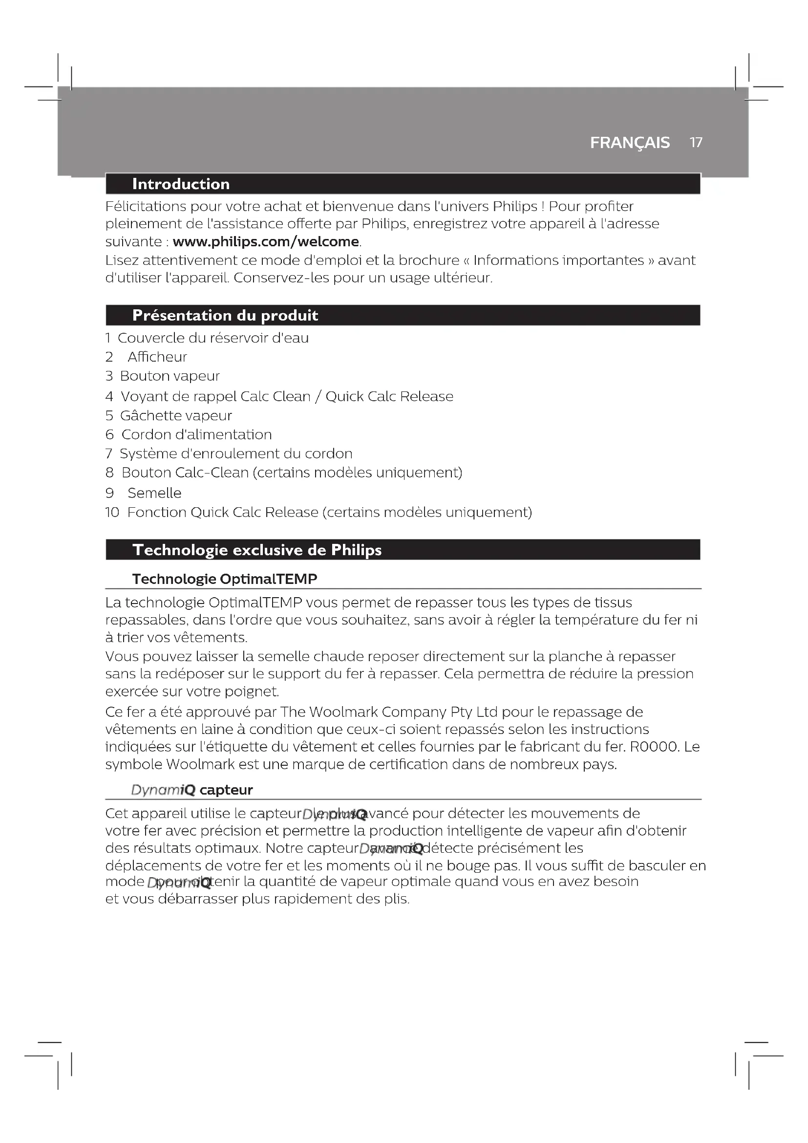 Problème Cause possible Solution Le fer n'est pas prêt. Patientez jusqu'à ce que le fer soit prêt (le voyant sur l'acheur cesse de clignoter). Le réglage vapeur ne change pas lorsque j'appuie sur le bouton vapeur situé sur la poignée. Le bouton vapeur modie les réglages de vapeur uniquement lorsque le fer est incliné. En position horizontale, le bouton vapeur sert de déclencheur pour libérer plus de vapeur, quel que soit le réglage que vous utilisez. Inclinez légèrement le fer vers le haut et appuyez sur le bouton vapeur pour modier le réglage de vapeur. Ce réglage a été conçu pour éviter que les utilisateurs ne modient accidentellement le réglage de vapeur en repassant. La housse de la planche à repasser devient humide ou des gouttes d'eau apparaissent sur le vêtement pendant le repassage. La vapeur s'est condensée sur la housse de la planche à repasser après une longue séance de repassage. Remplacez la housse de la planche à repasser si la mousse est usée. Vous pouvez ajouter une couche de feutre sous la housse de la planche à repasser pour empêcher la condensation sur la planche à repasser. Vous pouvez acheter le feutre dans un magasin de tissu. Votre housse de planche à repasser n'est pas conçue pour résister au débit élevé de vapeur de l'appareil. Mettez une couche supplémentaire de feutre sous la housse de la planche à repasser pour empêcher la condensation sur la planche à repasser. Vous pouvez acheter le feutre dans un magasin de tissu. Des gouttes d'eau tombent sur le vêtement lors du repassage. La fonction Eet pressing a été utilisée trop souvent pendant une courte période. Continuez à utiliser le fer en position horizontale et patientez quelques instants avant d'utiliser de nouveau la fonction Eet pressing. Vous n'avez pas fermé le couvercle du réservoir d'eau correctement. Appuyez sur le couvercle jusqu'à ce que vous entendiez un clic. Vous n'avez pas réinséré correctement le récepteur Quick Calc Release dans l'appareil (certains modèles uniquement). Arrêtez le repassage et laissez le fer à repasser refroidir pendant au moins 1 heure. Retirez le récepteur Quick Calc Release. Réinsérez-le dans l'appareil et assurez- vous que le récepteur est aligné avec la surface de l'appareil. Abaissez le levier (« clic »). Si le réservoir Quick Calc Release est endommagé, contactez le Service Consommateurs de votre pays (voir le dépliant de garantie internationale pour les coordonnées). Vous avez ajouté un produit chimique dans le réservoir d'eau. Rincez le réservoir d'eau et ne mettez aucun parfum ni produit chimique dans le réservoir d'eau. Le fer ne produit pas de jet de vapeur La fonction Eet pressing a été utilisée trop souvent pendant une courte période. Continuez à utiliser le fer en position horizontale et patientez quelques instants avant d'utiliser de nouveau la fonction Eet pressing. Vous commencez le repassage alors que le fer n'est pas encore prêt Patientez jusqu'à ce que le fer soit prêt (le voyant sur l'acheur cesse de clignoter). De l'eau sale et des impuretés s'écoulent de la semelle pendant le repassage. De l'eau calcaire avec des impuretés ou produits chimiques a formé des dépôts calcaires dans la semelle. Exécutez la fonction Quick Calc Release (certains modèles uniquement) ou Calc-Clean (certains modèles uniquement). Voir le chapitre « Nettoyage et entretien ». Un voyant clignote en orange sur la poignée du fer à repasser. Le voyant de rappel Calc Clean est activé. Il vous rappelle de procéder au détartrage. Exécutez la fonction Quick Calc Release (certains modèles uniquement) ou Calc-Clean (certains modèles uniquement). Voir le chapitre « Nettoyage et entretien ». Le fer laisse un voile ou une marque sur le vêtement. La surface à repasser était non plane, par exemple parce que vous repassiez sur une couture ou un pli dans le vêtement. Le fer à repasser peut être utilisé en toute sécurité sur tous les vêtements repassables. Les traces lustrées ne sont pas permanentes et disparaissent au lavage. Évitez de repasser sur les coutures ou plis. Vous pouvez aussi placer un chion en coton sur la zone à repasser an d'éviter les marques. Le fer fait beaucoup de bruit. Il n'y a pas d'eau dans l'appareil. Remplissez le réservoir d'eau.22 NEDERLANDS Introductie Gefeliciteerd met uw aankoop en welkom bij Philips! Registreer uw product op www.philips.com/welcome om optimaal gebruik te kunnen maken van de door Philips geboden ondersteuning. Lees deze gebruiksaanwijzing en de folder met belangrijke informatie zorgvuldig door voordat u het apparaat gebruikt. Bewaar ze om deze indien nodig later te kunnen raadplegen. Productoverzicht 1 Deksel van waterreservoir 2 Display 3 Knop 'Steam' (Stoom) 4 Calc-Clean-/Quick Calc Release-herinneringslampje 5 Stoomstootknop 6 Netsnoer 7 Snoerwikkelaar 8 Calc-Clean-knop (alleen bepaalde typen) 9 Zoolplaat 10 Quick Calc Release (alleen bepaalde typen) Exclusieve technologie van Philips OptimalTEMP-technologie De OptimalTEMP-technologie stelt u in staat om alle soorten strijkbare stoen in willekeurige volgorde te strijken zonder de strijktemperatuur aan te passen en uw kleding te sorteren. Het is veilig om de hete zoolplaat rechtstreeks op de strijkplank te zetten zonder het strijkijzer terug op het strijkijzerplateau te zetten. Dit is minder belastend voor uw pols. Dit strijkijzer is door The Woolmark Company Pty Ltd goedgekeurd voor het strijken van producten van 100% wol, op voorwaarde dat de kledingstukken volgens de instructies op het wasetiket en de instructies van de fabrikant van dit strijkijzer worden gestreken. R0000. Het Woolmark-logo is een keurmerk in veel verschillende landen. -sensor Dit apparaat maakt gebruik van de meest geavanceerde -sensor, die de bewegingen van uw strijkijzer precies herkent en die zorgt voor een intelligente stoomafgifte voor een perfect resultaat. Onze geavanceerde -sensor weet precies hoe uw strijkij