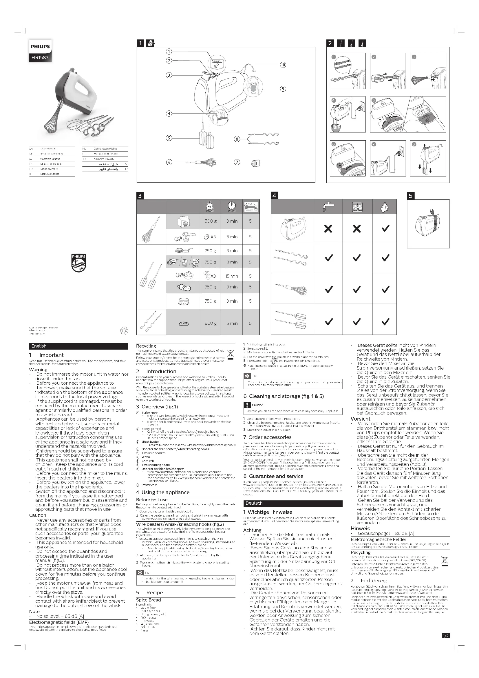 - Avant de nettoyer l'appareil ou de retirer un accessoire, débranchez- le. 1 Nettoyez le bloc moteur à l'aide d'un chion humide. 2 Nettoyez les fouets, les crochets à pétrir, le fouet simple à l'eau chaude (<60 °C) savonneuse ou au lave-vaisselle. 3 Rangez l'appareil dans un endroit sec. 7 Commande d'accessoires Pour acheter un mixeur plongeant et des accessoires de hachoir pour cet appareil, visitez notre site Web www.philips.com/shop. Si vous rencontrez des problèmes pour vous procurer des accessoires pour votre appareil, contactez le Service Consommateurs Philips de votre pays. Ses coordonnées sont disponibles à l'adresse www.philips.com/support.Vous pouvez commander le mini-hachoir à entraînement direct (code n° 3140 039 00211) en tant qu'accessoire supplémentaire de l'appareil HR1583 auprès de votre revendeur Philips ou auprès d'un Centre Service Agréé Philips. Suivez les quantités, les temps de préparation et les vitesses du mini-hachoir lorsque vous utilisez cet accessoire. 8 Garantie et service Si vous rencontrez un problème ou souhaitez obtenir des informations supplémentaires, visitez le site Web Philips à l'adresse www.philips.com/support ou contactez le Service Consommateurs Philips de votre pays. Vous trouverez le numéro de téléphone dans le dépliant de garantie internationale. S'il n'existe pas de Service Consommateurs dans votre pays, renseignez-vous auprès de votre revendeur Philips. Italiano 1 Importante Prima di utilizzare l'apparecchio, leggere attentamente il presente manuale dell'utente e conservarlo per eventuali riferimenti futuri. Avviso