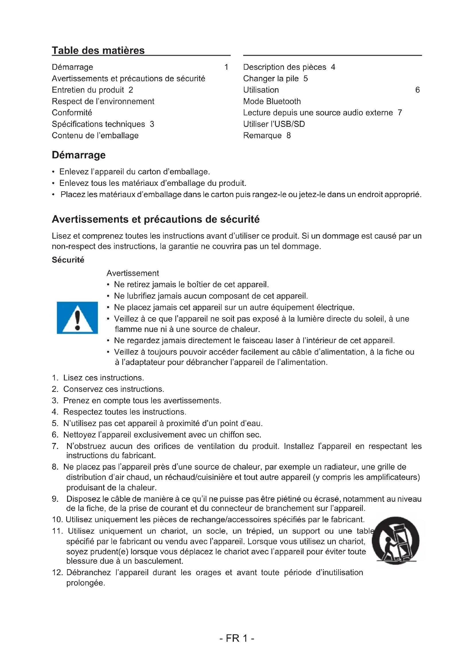 LISEZ COMPLÈTEMENT CE MANUEL D’UTILISATION AVANT D’UTILISER CET APPAREIL ET CONSERVEZ CE LIVRET POUR VOUS Y RÉFÉRER ULTÉRIEUREMENT. FR- FR 1 - Table des matières Démarrage 1 Avertissements et précautions de sécurité Entretien du produit 2 Respect de l’environnement Conformité Spécications techniques 3 Contenu de l’emballage Description des pièces 4 Changer la pile 5 Utilisation 6 Mode Bluetooth Lecture depuis une source audio externe 7 Utiliser l’USB/SD Remarque 8 Démarrage