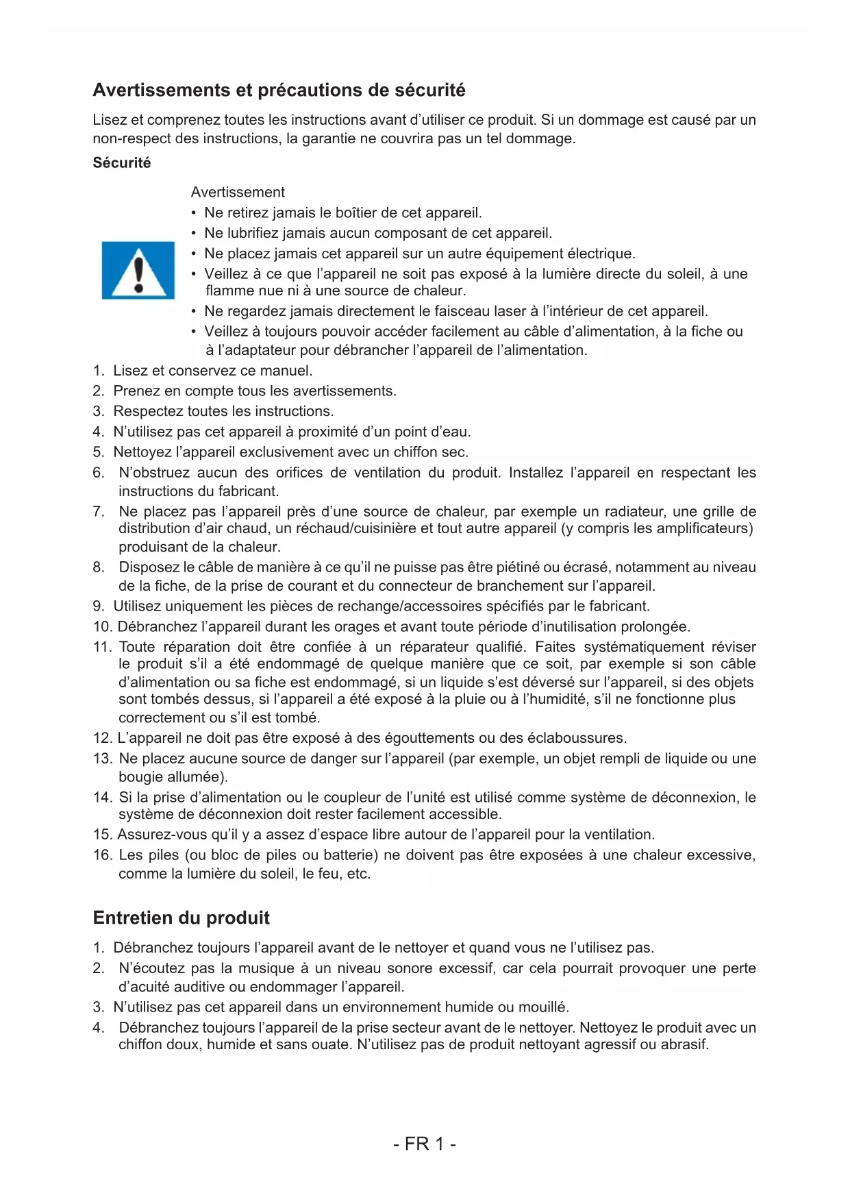 LISEZ COMPLÈTEMENT CE MANUEL D’UTILISATION AVANT D’UTILISER CET APPAREIL ET CONSERVEZ CE LIVRET POUR VOUS Y RÉFÉRER ULTÉRIEUREMENT FR- FR 1 - Avertissements et précautions de sécurité Lisez et comprenez toutes les instructions avant d’utiliser ce produit. Si un dommage est causé par un non-respect des instructions, la garantie ne couvrira pas un tel dommage. Sécurité Avertissement