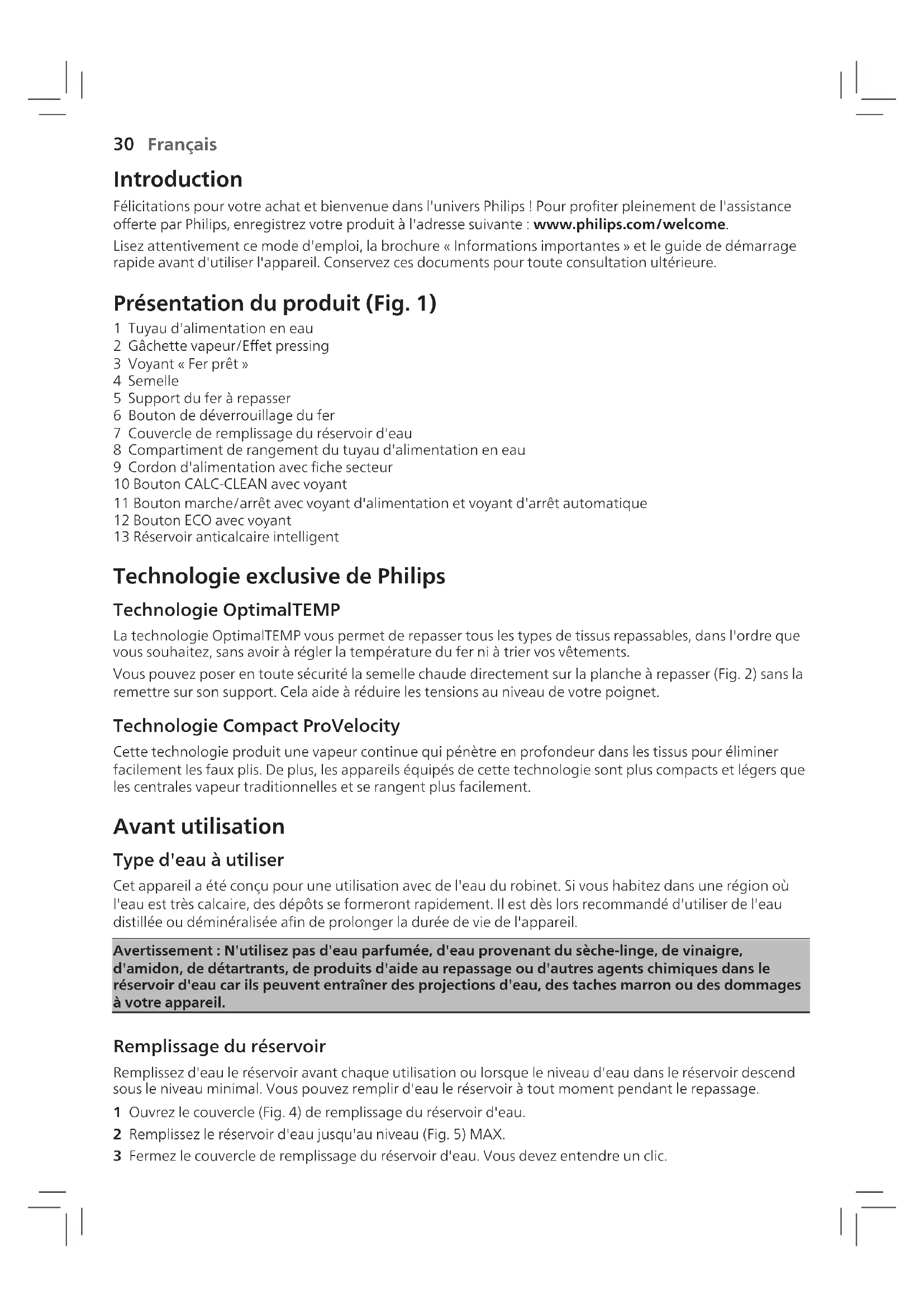 d'amidon, de détartrants, de produits d'aide au repassage ou d'autres agents chimiques dans le réservoir d'eau car ils peuvent entraîner des projections d'eau, des taches marron ou des dommages à votre appareil. Remplissage du réservoir Remplissez d'eau le réservoir avant chaque utilisation ou lorsque le niveau d'eau dans le réservoir descend sous le niveau minimal. Vous pouvez remplir d'eau le réservoir à tout moment pendant le repassage. 1 Ouvrez le couvercle (Fig. 4) de remplissage du réservoir d'eau. 2 Remplissez le réservoir d'eau jusqu'au niveau (Fig. 5) MAX. 3 Fermez le couvercle de remplissage du réservoir d'eau. Vous devez entendre un clic. Français31 Utilisation de l'appareil Tissus repassables Ne repassez pas des tissus non repassables. - Les tissus portant les symboles (Fig. 6) suivants sont repassables. Par exemple, le lin, le coton, le polyester, la soie, la laine, la viscose et la rayonne (soie articielle). - Les tissus dont l'étiquette porte le symbole (Fig. 7) suivant ne sont pas repassables. Parmi ces tissus: les tissus synthétiques tels que l'élasthanne, les tissus comprenant de l'élasthanne et des polyolénes (par exemple du polypropylène). Les impressions sur les vêtements ne sont pas repassables non plus. Repassage 1 Placez la centrale vapeur sur une surface stable et plane. Remarque: An de garantir un repassage en toute sécurité, nous vous recommandons de toujours placer la base sur une planche à repasser stable. 2 Assurez-vous qu'il y a susamment d'eau dans le réservoir d'eau. 3 Branchez la che secteur sur une prise murale avec mise à la terre, puis appuyez sur le bouton marche/ arrêt pour mettre la chaudière sous tension.Attendez jusqu'à ce que le voyant «Fer prêt» reste (Fig. 8) allumé. Ceci prend environ 2minutes. 4 Retirez le tuyau d'alimentation en eau de son compartiment de rangement. 5 Appuyez sur le bouton de déverrouillage pour détacher le fer de son support (Fig. 9). 6 Appuyez sur le bouton vapeur et maintenez-le enfoncé pour commencer le repassage (Fig. 10). 7 Pour de meilleurs résultats, après un repassage à la vapeur, eectuez les derniers mouvements sans vapeur.