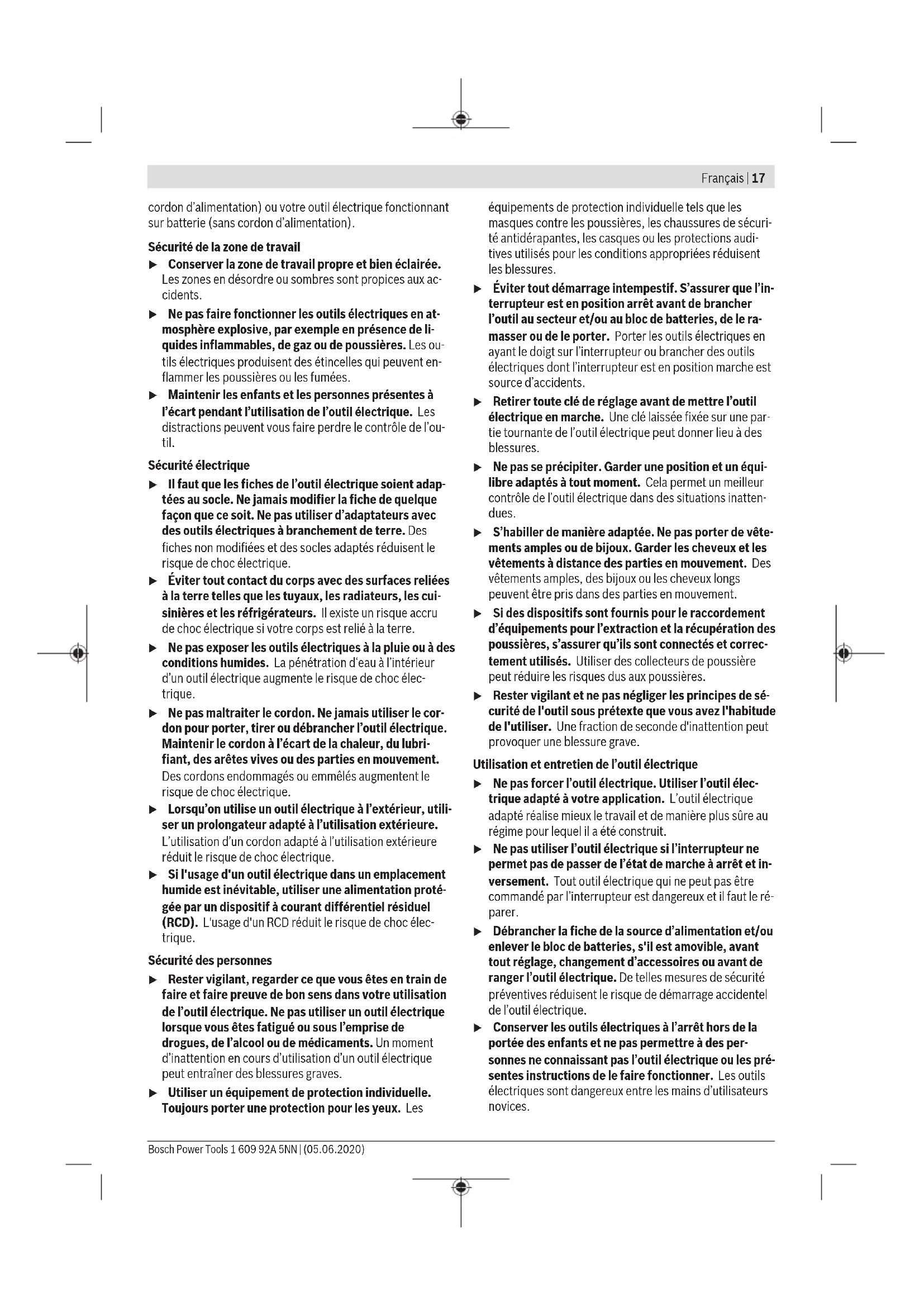 Mise en place/retrait d’une feuille abrasive Le plateau de ponçage (14) est doté d’un revêtement auto- agrippant permettant d’utiliser des feuilles abrasives avec système auto-agrippant. Celles-ci peuvent être fixées rapi- dement et facilement. Tapotez légèrement sur le revêtement auto-agrippant du pla- teau de ponçage (14) avant de mettre en place la feuille abrasive (15) afin d’obtenir une adhérence optimale. Positionnez sur l’un des côtés la feuille abrasive (15) au ras du plateau de ponçage (14) puis appliquez fermement la feuille abrasive contre le plateau de ponçage, sur toute la surface, de façon à obtenir une adhérence parfaite. Afin de garantir une bonne aspiration de la poussière, assu- rez-vous que les perforations de la feuille abrasive et du pla- teau de ponçage coïncident. Pour retirer la feuille abrasive (15), saisissez-la par un coin et retirez-la du plateau de ponçage (14). Il est possible d’utiliser toutes les feuilles abrasives, tous les non-tissés à polir et non-tissés de nettoyage de 93 mm de la gamme d’accessoires Bosch pour ponceuses delta. Procédez de la même façon pour fixer les accessoires de ponçage tels que non‑tissés ou feutres à polir. Aspiration de poussières/de copeaux Les poussières de matériaux tels que peintures contenant du plomb, certains bois, minéraux ou métaux, peuvent être nui- sibles à la santé. Le contact avec les poussières ou leur inha- lation peut entraîner des réactions allergiques et/ou des ma- ladies respiratoires auprès de l’utilisateur ou des personnes se trouvant à proximité. Certaines poussières telles que les poussières de chêne ou de hêtre sont considérées comme cancérigènes, surtout en association avec des additifs pour le traitement du bois 1 609 92A 5NN | (05.06.2020) Bosch Power ToolsFrançais | 25 (chromate, lasure). Les matériaux contenant de l’amiante ne doivent être travaillés que par des personnes qualifiées. – Si possible, utilisez un dispositif d’aspiration des pous- sières approprié au matériau. – Veillez à bien aérer la zone de travail. – Il est recommandé de porter un masque respiratoire avec un niveau de filtration de classe P2. Respectez les règlements spécifiques aux matériaux à traiter en vigueur dans votre pays. u Évitez toute accumulation de poussières sur le lieu de travail. Les poussières peuvent facilement s’enflammer. Raccordement à un aspirateur (voir figure A) Le dispositif d’aspiration (13) n’est conçu que pour les tra- vaux avec le plateau de ponçage (14), il n’est d’aucune utilité avec d’autres accessoires de travail. Utilisez toujours un aspirateur pour les travaux de ponçage. Pour monter le dispositif d’aspiration (13) (accessoire), reti- rez l’accessoire de travail et la butée de profondeur (10). Glissez jusqu’en butée le dispositif d’aspiration (13) sur le collet de l’outil électroportatif, par dessus le porte-outil (6). Faites pivoter le dispositif d’aspiration dans la position sou- haitée (pas directement sous l’outil électroportatif). Refer- mez ensuite le levier de serrage (16) pour fixer le dispositif d’aspiration. Emboîtez l’adaptateur d’aspiration (18) du flexible d’aspira- tion (19) sur la tubulure de sortie d’air (17) de l’outil électro- portatif. Raccordez l’autre extrémité du tuyau d’aspiration (19) à un aspirateur (accessoire). Vous trouverez au début de cette notice (pages graphiques) une vue d’ensemble des aspirateurs auxquels peut être rac- cordé l’outil électroportatif. L’aspirateur doit être conçu pour le type de matériau à pon- cer. Pour l’aspiration de poussières particulièrement nuisibles à la santé, cancérigènes ou sèches, utilisez un aspirateur spé- cial. Utilisation Mise en marche Montage de l’accu Remarque : L’utilisation d’accus non conçus pour votre outil électroportatif peut entraîner des dysfonctionnements ou endommager l’outil électroportatif. Insérez l’accu chargé (3) par l’arrière dans le pied de l’outil électroportatif. Poussez l’accu à fond dans le pied jusqu’à ce qu’il soit correctement verrouillé. Mise en marche/arrêt u Assurez-vous de pouvoir actionner l’interrupteur Marche/Arrêt sans avoir à relâcher la poignée. Pour mettre en marche l’outil électroportatif, poussez l’in- terrupteur Marche/Arrêt (1) vers l’avant dans la position «I». Pour arrêter l’outil électroportatif, poussez l’interrupteur Marche/Arrêt (1) vers l’arrière dans la position «0». L’éclairage améliore la visibilité dans la zone de travail. Il est automatiquement activé et désactivé en même temps que l’outil électroportatif. u Ne regardez pas directement les LED. Risque d’éblouissement. Remarque : En cas d’arrêt automatique de l’outil électropor- tatif pour cause d’accu vide ou de surchauffe, il faut que vous arrêtiez manuellement l’outil électroportatif avec l’interrup- teur Marche/Arrêt (1). Rechargez l’accu ou laissez refroidir l’outil électroportatif avant de le remettre en marche. L’accu risque sinon d’être endommagé. Présélection de la vitesse d’oscillation La molette de présélection (4) permet de présélectionner la vitesse d’oscillation voulue, même en cours de fonctionne- ment. La vitesse d’oscillation requise dépend du type de matériau et des conditions de travail. Elle peut être déterminée par des essais pratiques. Recommandations de vitesse : vitesse « 6 » pour le sciage, tronçonnage et ponçage de matériaux durs tels que le bois ou le métal, vitesse « 4 » pour les matériaux tendres tels que les matières plastiques. Instructions d’utilisation u Retirez l’accu de l’appareil électroportatif avant toute intervention (opérations d’entretien/de maintenance, changement d’accessoire, etc.) ainsi que lors de son transport et rangement. Il y a sinon risque de blessure lorsqu’on appui