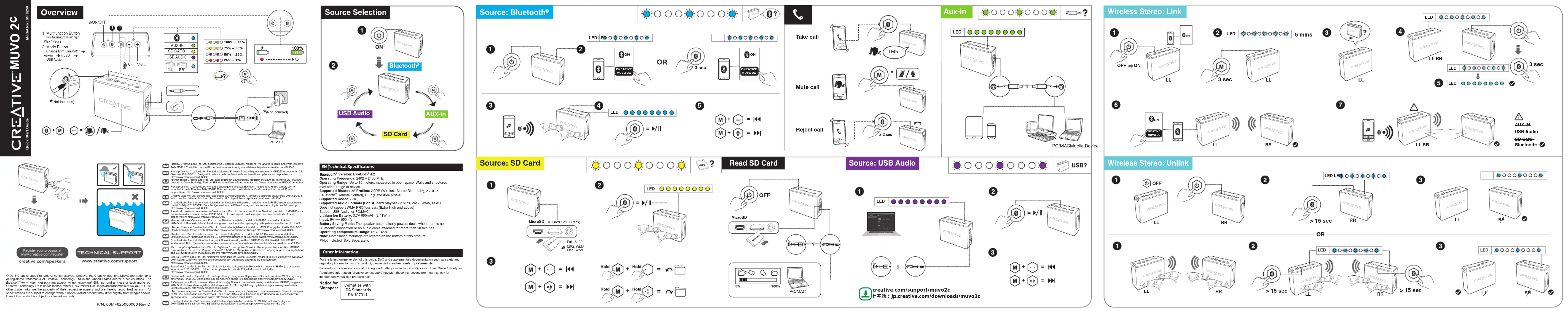 Fréquence de Fonctionnement: 2402 – 2480 MHzPortée de Fonctionnement: Jusqu'à 10 mètres, mesurés dans un espace ouvert. Les murs et les structures peuvent influer sur la portée du périphérique.Profils Bluetooth Pris en Charge: A2DP (Bluetooth stéréo sans fil), AVRCP (télécommande Bluetooth ), HFP (profil mains-libres)Codecs Pris en Charg: SBCFormats audio pris en charge (pour la lecture de carte SD) : MP3, WAV, WMA, FLACNe prend pas en charge WMA PRO/sans perte (Extra High et supérieur)Prend en charge l'audio USB pour PC/MACBatterie Lithium-Ion: 3,7 V 650 mAH (2.41 Wh)Entrée: 5V 650mA Économie d’énergie: Le haut-parleur se met automatiquement hors tension s'il n'existe aucune connexion Bluetooth ou si aucun câble audio n'est raccordé pendant plus de 10 minutes.Températures de Fonctionnement du Périphérique: 0ºC – 45ºCRemarque : le marquage de conformité est situé sur la partie inférieure de ce produit. Non inclus. Vendu séparément. Pour la version en ligne à jour de ce guide, DoC et d'autres documents sur ce produit, concernant notamment la sécurité et la réglementation, consultez le site creative.com/support/muvo2cDes instructions détaillées sur le démontage de la batterie intégrée peuvent être trouvées à Guide de démarrage rapide / Informations sur la sécurité et la réglementation (creative.com/support/muvo2c), ces instructions sont strictement destinées à des professionnels indépendants qualifiés. Autres Informations Die neueste Online-Version dieses Handbuchs sowie Zusatzinformationen zu diesem Produkt (z. B. Sicherheitshinweise und Informationen zu gesetzlichen Bestimmungen, DoC) finden Sie unter creative.com/support/muvo2cEine detaillierte Anleitung zum Ausbau des integrierten Akkus finden Sie unter Kurzanleitung Benutzerhandbuch / Sicherheits- und rechtliche Hinweise (creative.com/support/muvo2c), diese. Anleitung richtet sich ausschließlich an unabhängige, qualifizierte Techniker. Weitere Informationen