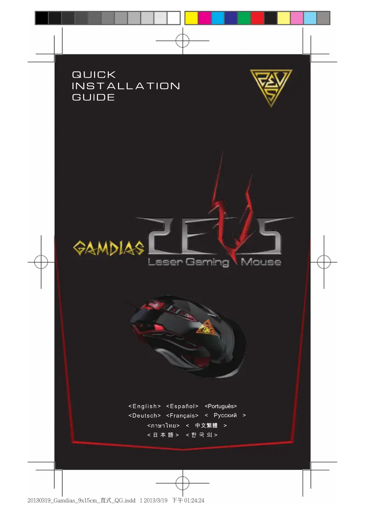 <Español> 20130319_Gamdias_9x15cm_直式_QG.indd 4 2013/3/19 下午 01:24:26Nous vous remercions d'avoir choisi la souris de jeu laser ZEUS de GAMDIAS ™ . La GAMDIAS ™ ZEUS utilise un microprocesseur premium 32 bits ARM Cortex, avec un capteur laser 8200DPI d'une précision parfaite. 512KB de mémoire flash intégrée et 9 combinaisons de touches pour permettre l'exécution de plusieurs tâches sans installation de pilote. Conception ergonomique avec des panneaux latéraux ajustables pour un contrôle, un équilibre et une précision impeccables. Instalar el hardware y el software Installation matérielle et logicielle Réglage des panneaux latéraux de la ZEUS Paramètres par défaut de ZEUS