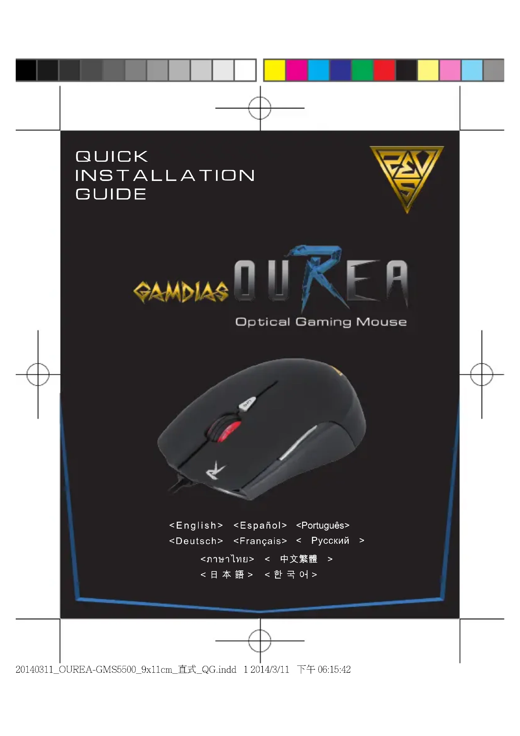 Registrar el ratón óptico juegos GAMDIAS™ OUREA Visite el sitio Web www.GAMDIAS.com para registrar el producto en línea. Requisitos del sistema Contenido del paquete ● Windows ® XP/Vista/7/8 ● PC con puerto USB ●Conexión a Internet (para instalación de software HERA) ● Ratón óptico para juegos GAMDIAS ™ OUREA ● Guía de instalación rápida en varios idiomas ● Pegatina GAMDIAS ™ Optical Gaming Mouse 20140311_OUREA-GMS5500_9x11cm_直式_QG.indd 5 2014/3/11 下午 06:15:43<Français> Contenu de l'emballage ● Souris optique de jeu GAMDIAS ™ OUREA ● Guide d'installation rapide en plusieurs langues ● Autocollant GAMDIAS ™ Merci d'avoir choisi la souris optique de jeu OUREA de GAMDIAS ™ . La souris de jeu GAMDIAS ™ OUREA utilise un micro-processeur de haut niveau complété par un capteur optique 2500 DPI d'une précision parfaite. Fournissant non seulement une stabilité irréprochable, la conception avec une mémoire intégrée de 64K et 6 touches macro permet l'exécution de combo sans installation de pilote. La conception ergonomique et symétrique assure le confort et la sensation tactile, même après une utilisation prolongée en jeu. Installation matérielle et logicielle Paramètres par défaut de OUREA