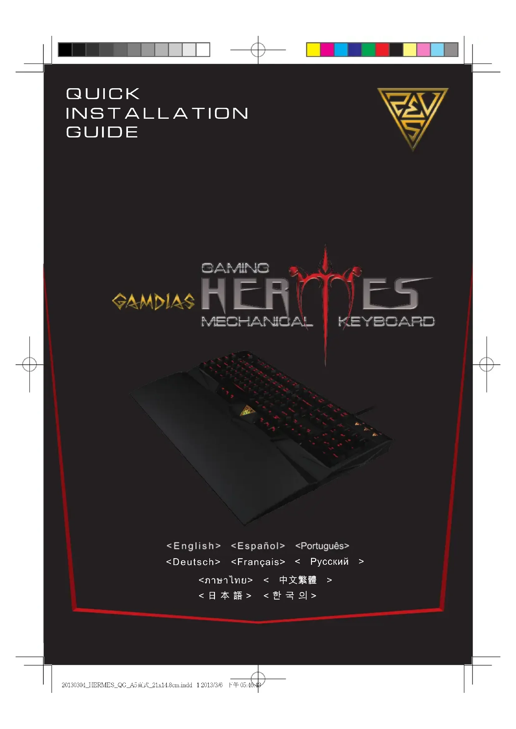 20130304_HERMES_QG_A5直式_21x14.8cm.indd 4 2013/3/6 下午 05:46:53Nous vous remercions d'avoir choisi le clavier de jeu mécanique GAMDIAS ™ HERMES. Le GAMDIAS ™ HERMES utilise un micro-processeur de choix ARM Cortex 32 bits et 512 Ko de mémoire, avec des sélections complètes N-Key / 6-Key rollover et 116 touches macro. Les contacts Cherry ™ Blue et la conception exclusive brevetée par GAMDIAS ™ ELEMENT offrent une réponse et un retour tactile ultimes. Installation matérielle et logicielle
