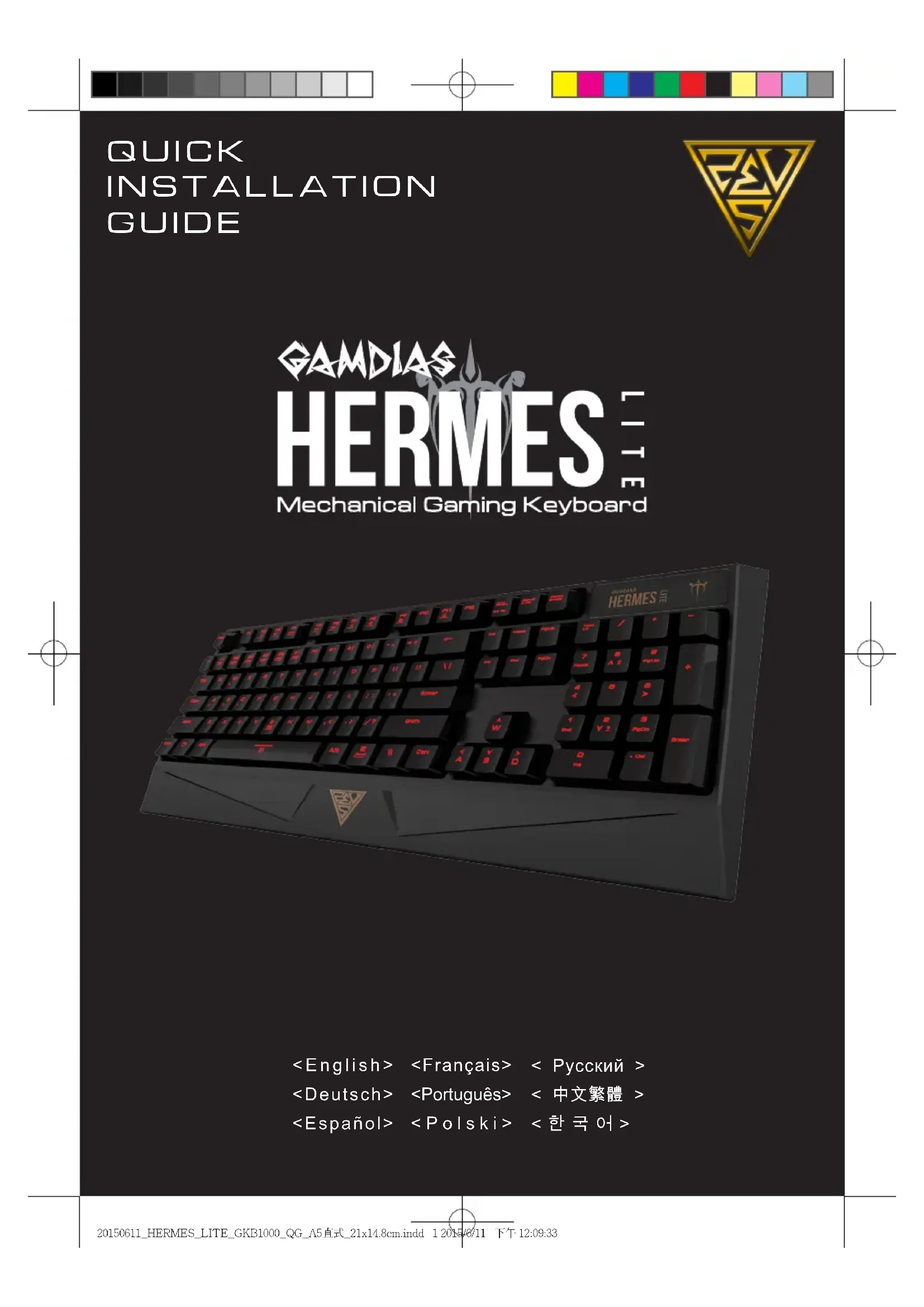 - Si no se pulsa ninguna tecla durante 20 segundos mientras dura el paso (2) de proceso grabación macro o el paso (4) del proceso de especicación de la tecla macro, la grabación macro terminará automáticamente y todas las teclas regresarán a sus estados originales. Registre su teclado mecánico GAMDIAS™ Hermes Lite Visite www.GAMDIAS.com para registrar el producto online Contenido del paqueteRequisitos del sistema ● Teclado mecánico GAMDIAS ™ Hermes Lite ● Extractor de teclas ● Guía de instalación rápida en varios idiomas ● Pegatina de GAMDIAS ™ ● Windows ® XP/ Vista/ 7 / 8 ● PC con puertos USB ● Conexión a Internet (para poder instalar el software HERA) ● Software GAMDIAS ™ HERA 20150611_HERMES_LITE_GKB1000_QG_A5直式_21x14.8cm.indd 4 2015/6/11 下午 12:09:34<Français> Nous vous remercions d’avoir acheté le clavier mécanique e-sports GAMDIAS ™ Hermes Lite. La mise au point de la série des produits Hermes et les principes de conception d’ Hermes Lite ont été orientés selon les besoins élémentaires des utilisateurs. Des dimensions de clavier allégées et simpliées, une maniabilité et un espace considérablement améliorés, le rétroéclairage cinq phases et le témoin lumineux à pulsations procurent aux joueurs une expérience sensationnelle. Le mode d’inversion des touches multi-envoi et des touches de direction WASD permet au joueur de déployer toute sa puissance de frappe au cours du jeu. En plus de 6 touches de jeux macrocongurées, le clavier est pourvu de 2 touches de raccourci synthétiques qui font de vous un adversaire de jeu rapide, féroce et précis. Installation du matériel et des logiciels