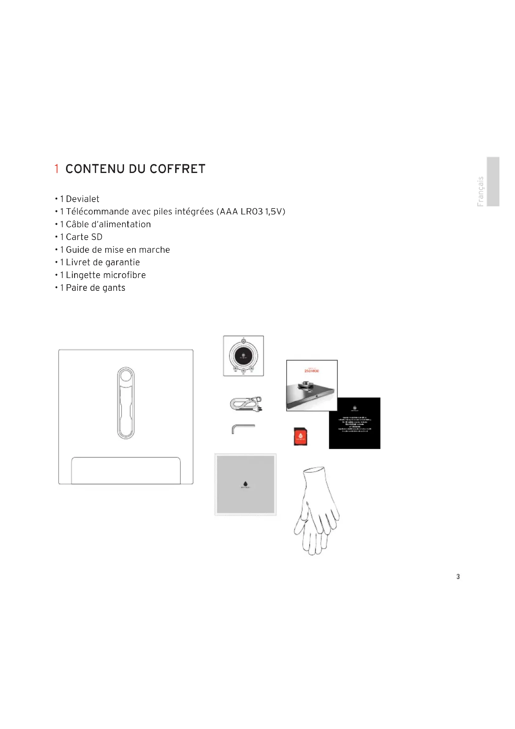 - 1 Paire de gants 1 CONTENU DU COFFRETAvant la mise en marche de votre Devialet, il est indispensable de l’enregistrer sur notre site internet. Pour ce, munissez vous du numéro de série de votre Devialet indiqué au dos de ce manuel et rendez-vous sur votre espace personnel à l’adresse www.devialet.com/login. Enregistrer votre Devialet vous donne accès :