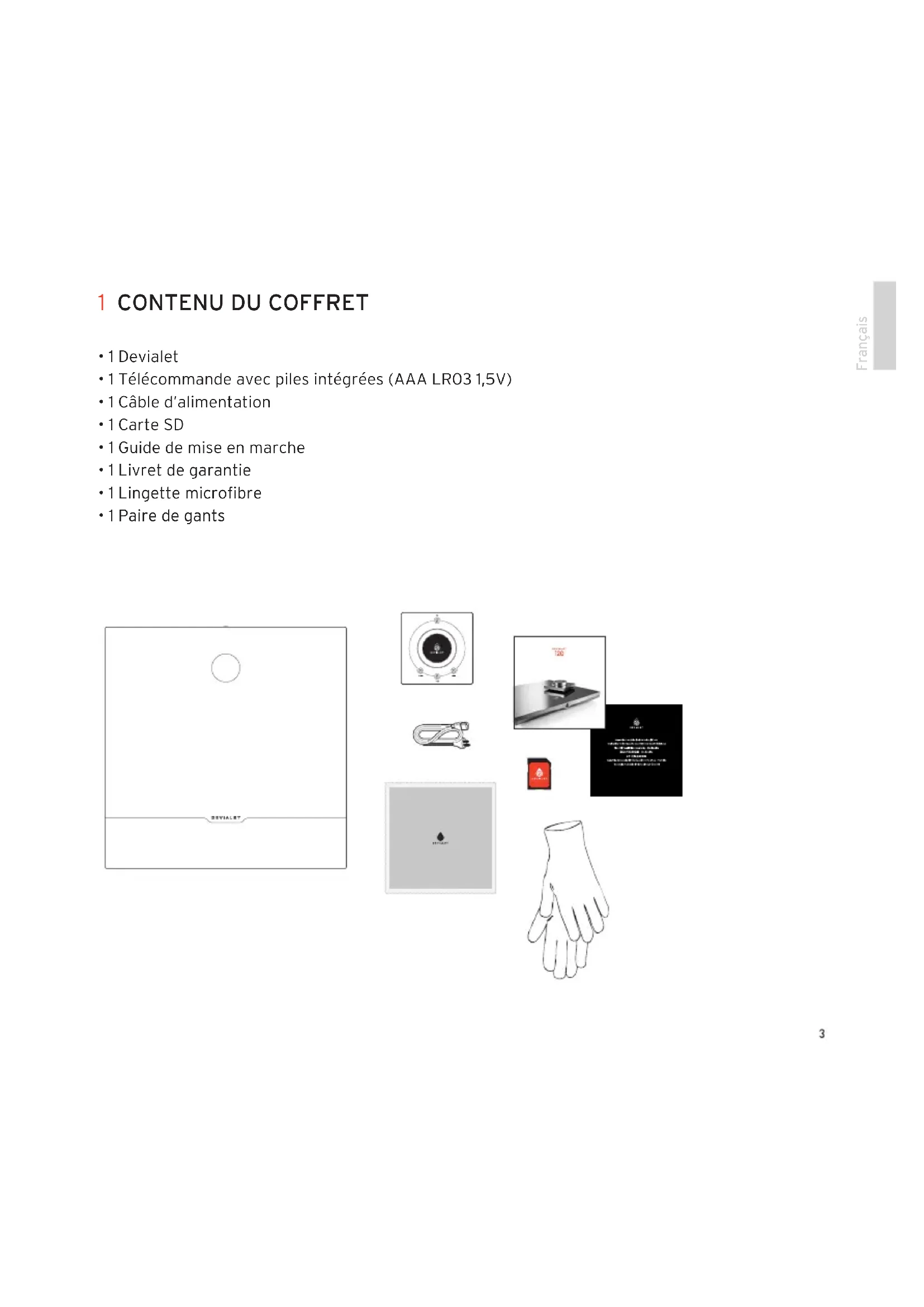 - 1 Paire de gants 1 CONTENU DU COFFRETAvant la mise en marche de votre Devialet, il est indispensable de l’enregistrer sur notre site internet. Pour ce, munissez vous du numéro de série de votre Devialet indiqué au dos de ce manuel et rendez-vous sur votre espace personnel à l’adresse www.devialet.com/login. Enregistrer votre Devialet vous donne accès :