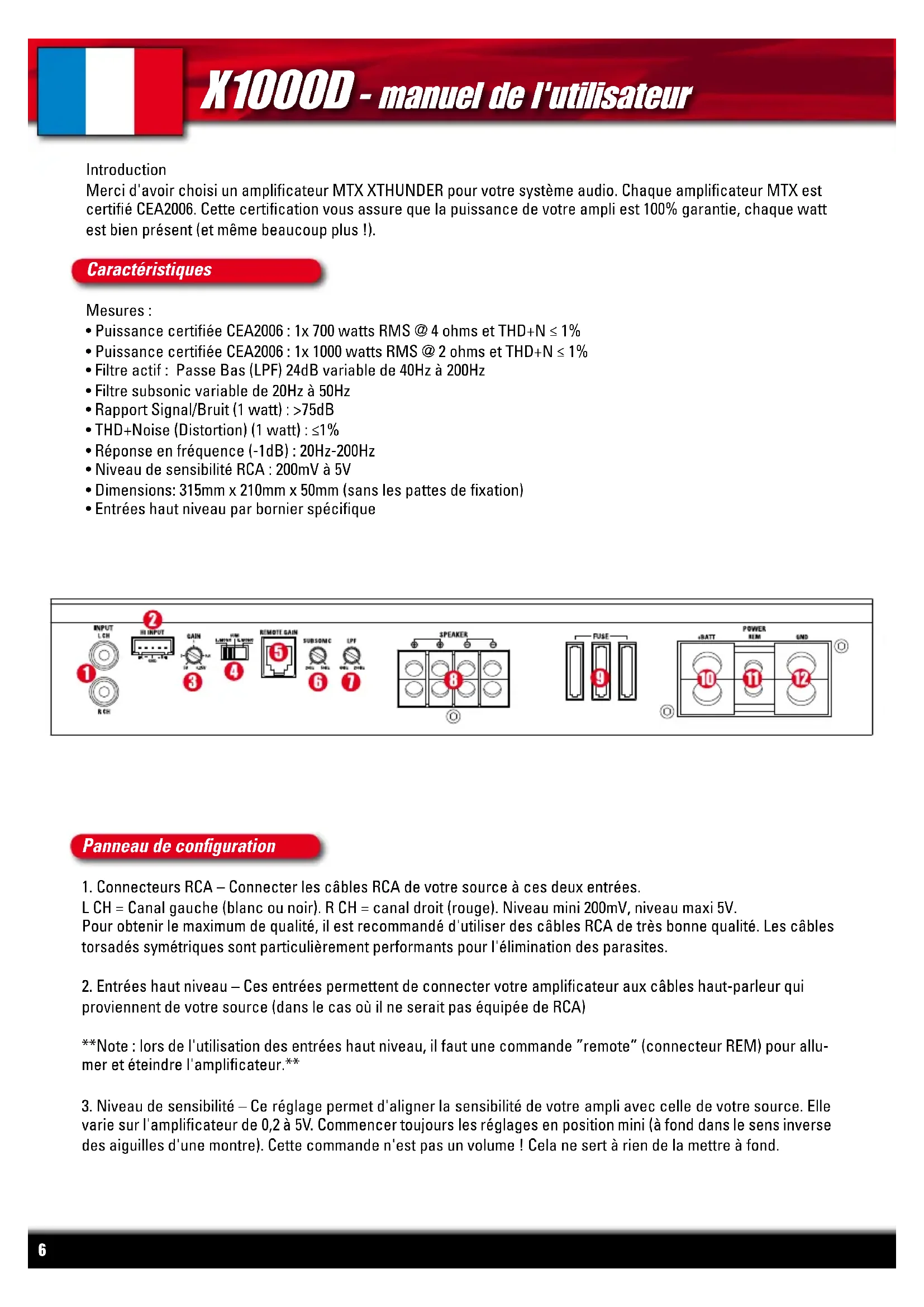 Merci d'avoir choisi un amplificateur MTX XTHUNDER pour votre système audio. Chaque amplificateur MTX est certifié CEA2006. Cette certification vous assure que la puissance de votre ampli est 100% garantie, chaque watt est bien présent (et même beaucoup plus !).