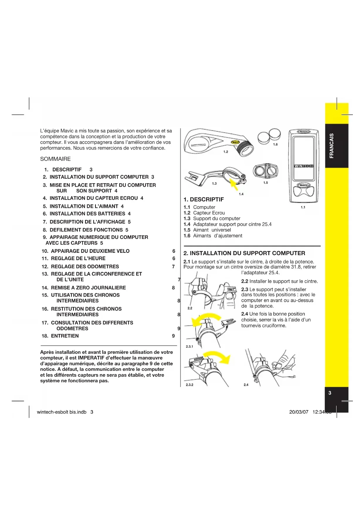 choisie, serrer la vis à l’aide d’un tournevis cruciforme. L’équipe Mavic a mis toute sa passion, son expérience et sa compétence dans la conception et la production de votre compteur. Il vous accompagnera dans l’amélioration de vos performances. Nous vous remercions de votre confiance. SOMMAIRE
