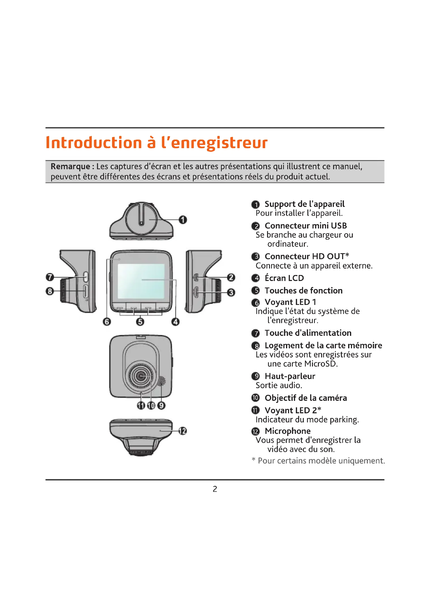- Pour certains modèle uniquement.10 Fonctionnement de base Allumer ou éteindre l’enregistreur Terminez l'installation en suivant les instructions de la section « Utiliser votre enregistreur dans un véhicule ».