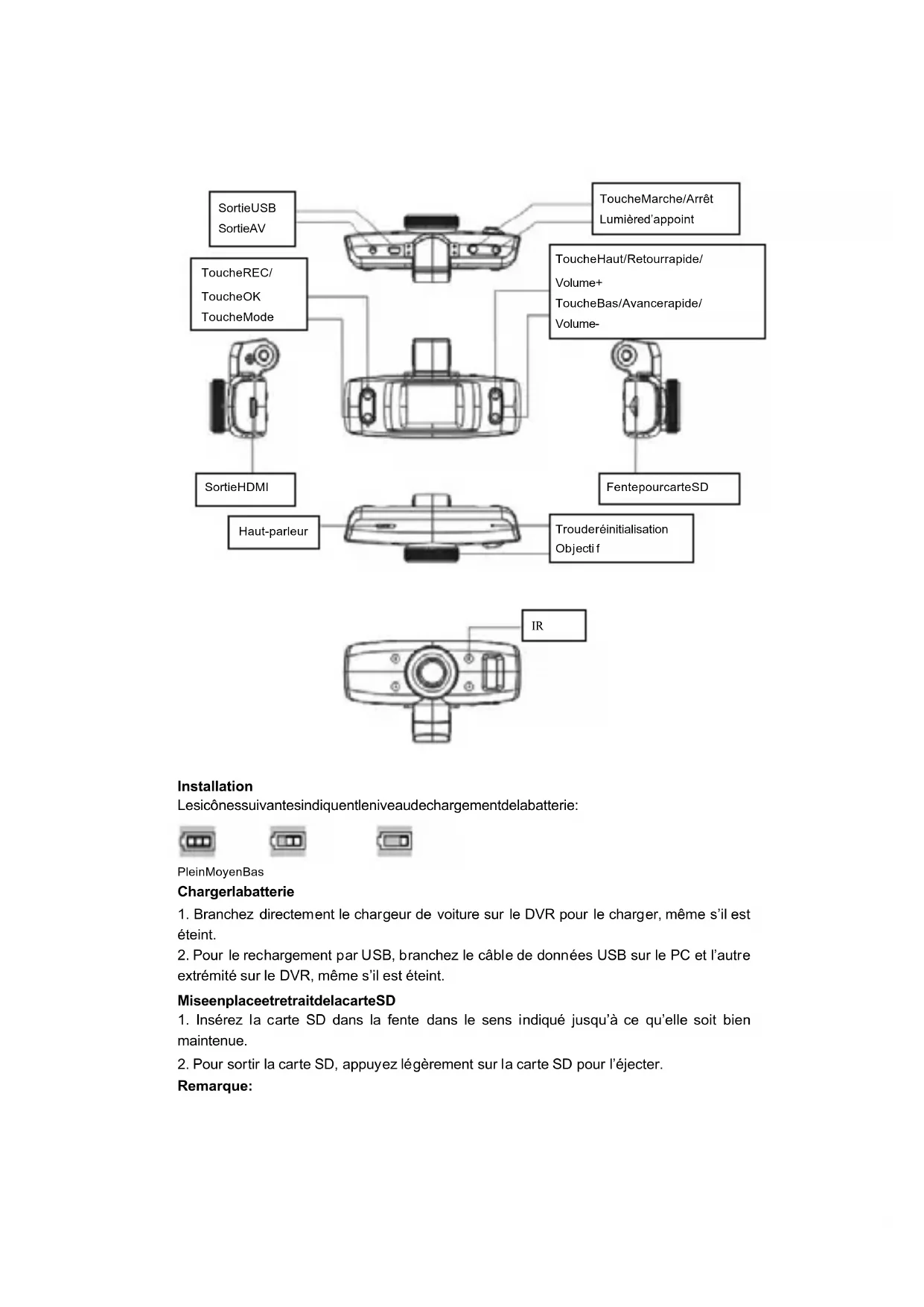 faire dfiler les photos et les vidos. Conseil: sans pilote install,ledisquemobilepeut(tre utilis quand le DVR est allum.Remarques: Si lappareil se plante suite une mauvaise manipulation, appuyez sur le bouton Rinitialiser pour redmarrer et restaurer. Caractristiques techniques Taille de lcran LCD 1,5',4:3,TFTLCD Objectif 120, haute rsolution classe A+ super grand angle Langue pour les options allemand, anglais (par dfaut), fran"ais, espagnol, italien, portugais, polonais, russe, nerlandais, grec, hongrois, tch,que, danois, sudois, norvgien et finnois Taille de la vido 720P/480P Format vidoAVI Rsolution photo 3 M, (12 M, 8 M et 5 M avec interpolation) Format photo JPG Carte mmoire SD Microphone/haut-parl eur intgr Mode Prise de vue simple/retardateur /(2 s/5 s/10 s)/continu Frquence de la source de lumi,re 50Hz/60Hz Sortie TV NTSC/PAL Port USB USB 2.0 Port dalimentation lectrique 5V , 500mA Batterie intgre, 3,7V, 350mAh Syst,me dexploitation du PC Windows 2000/XP/Vista/Windows 7/Windows 8, MAC OSX 10.3.6 ou suprieur. Remarque : Nous nous rservons le droit de modifier la conception et les caractristiques de ce produit sans pravis.Installeren Voor het batterijniveau, zie de volgende pictogrammen: Vol Halfvol Leeg Accu laden
